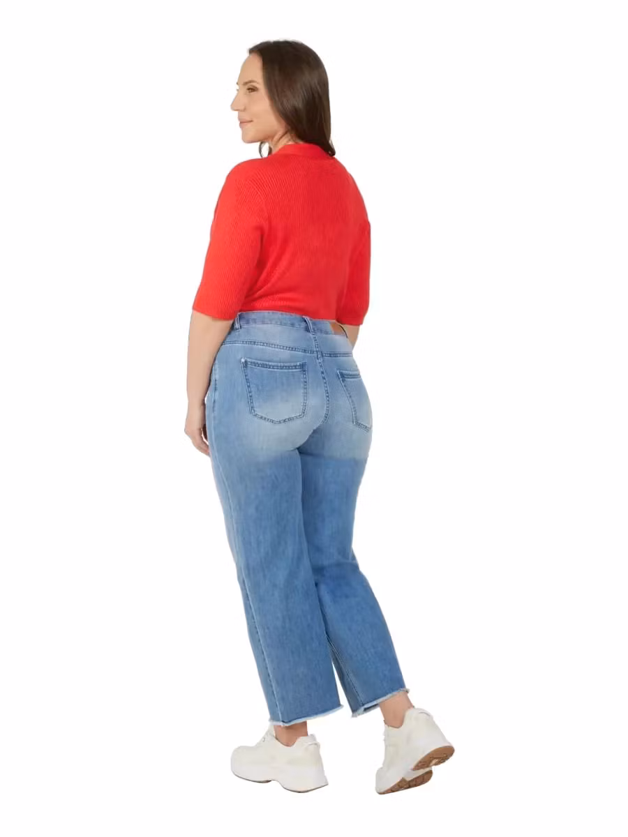 Tuffa raka Selma-jeans med fickor, hällor runt om, gylf och knapp. Flisig kant nedtill, kan enkelt anpassas efter egen längd.