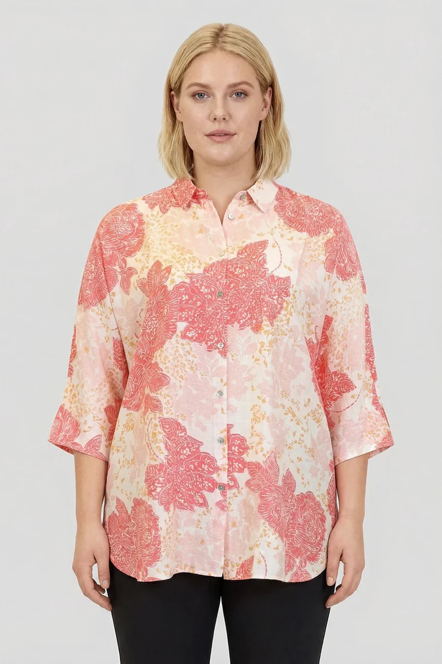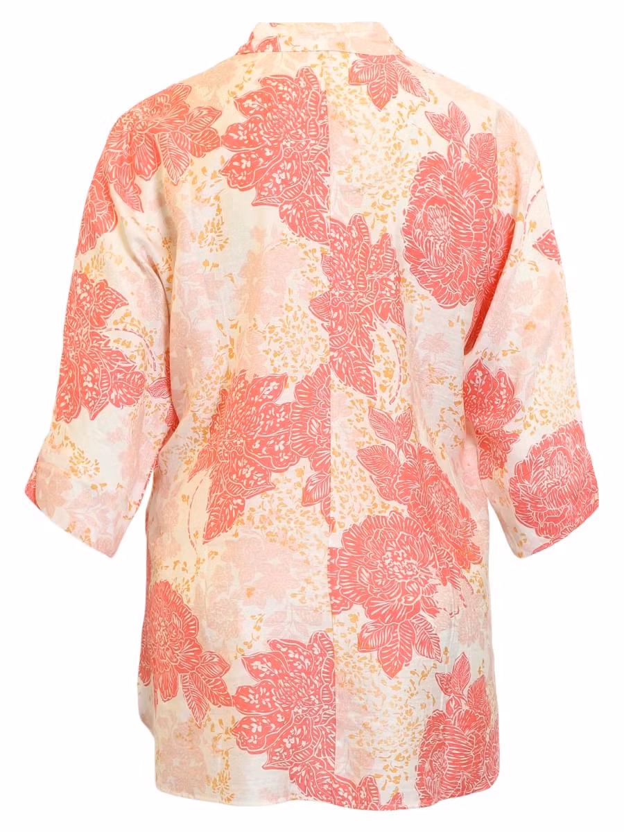 Skjorta i snygga behagliga färger och fint mönster. 3/4 ärmar. V-halsringning och genomgående knäppning med knappar framtill.