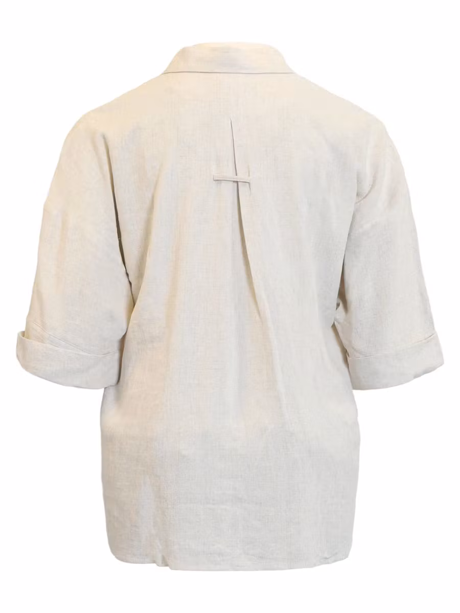 Skjorta i snygg sandfärg och 1/2 ärmar. V-halsringning med krage och genomgående knäppning med knappar framtill.