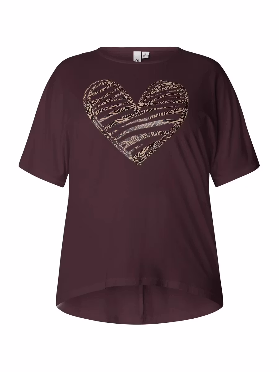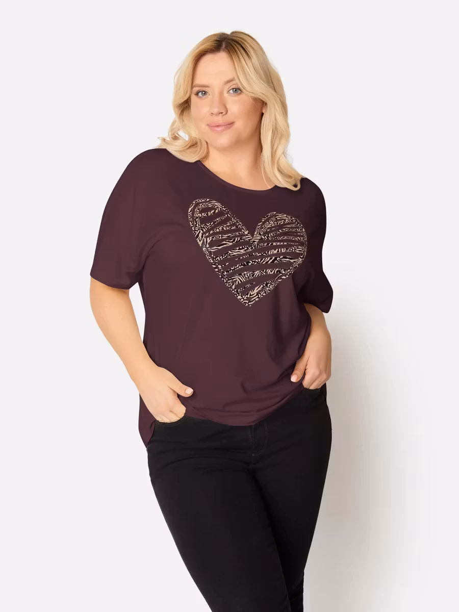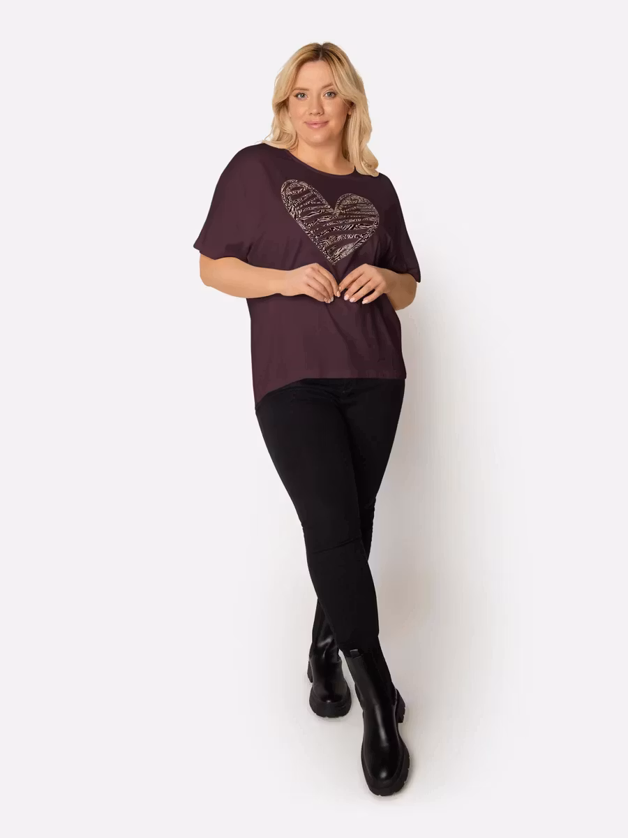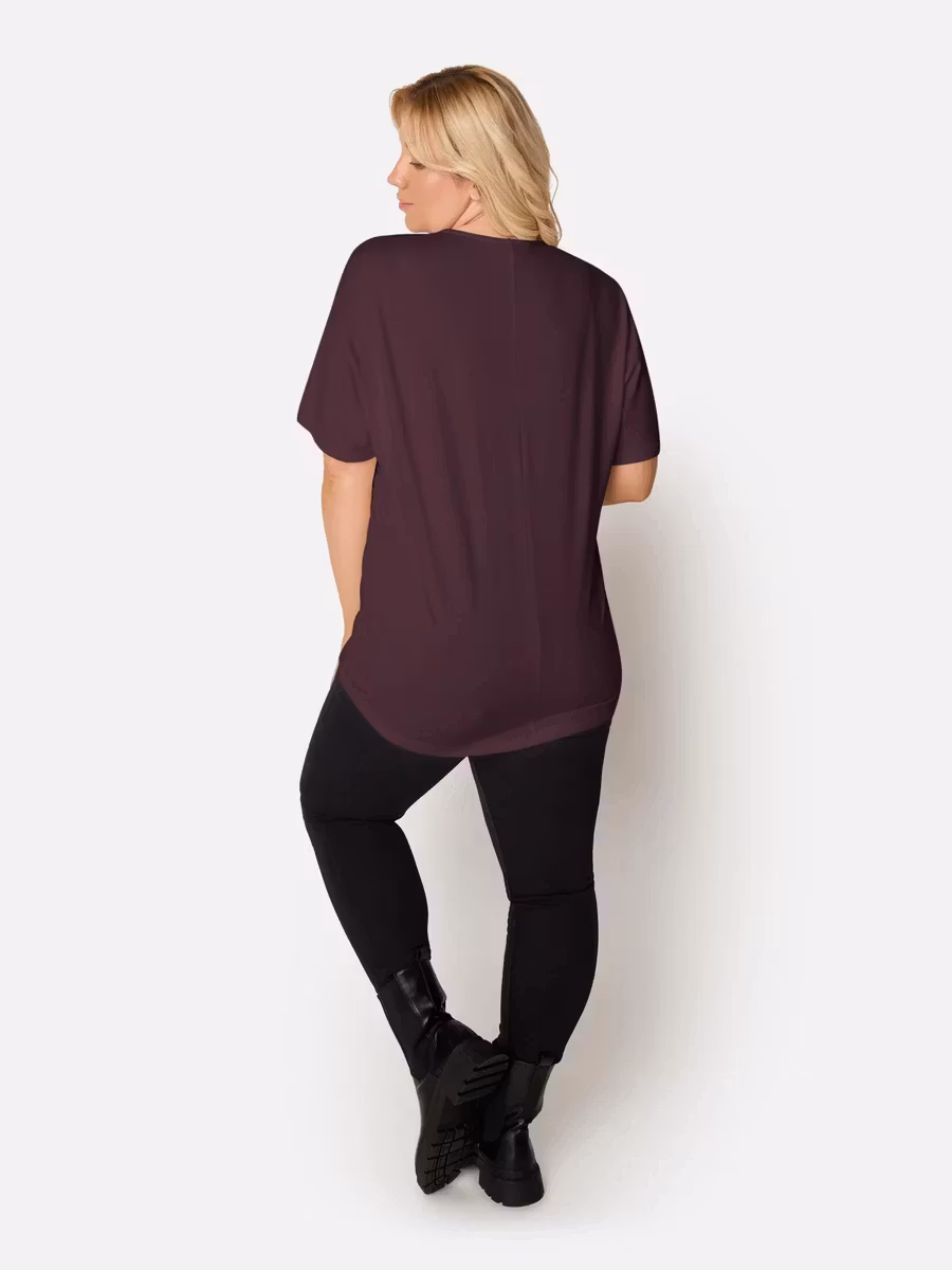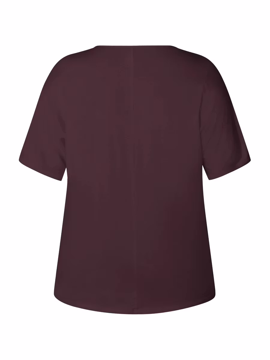 Topp i aubergin färg med fint motiv, korta ärmar och rund halsringning. Toppen är lite längre baktill. Passar snyggt till ett par svarta byxor.