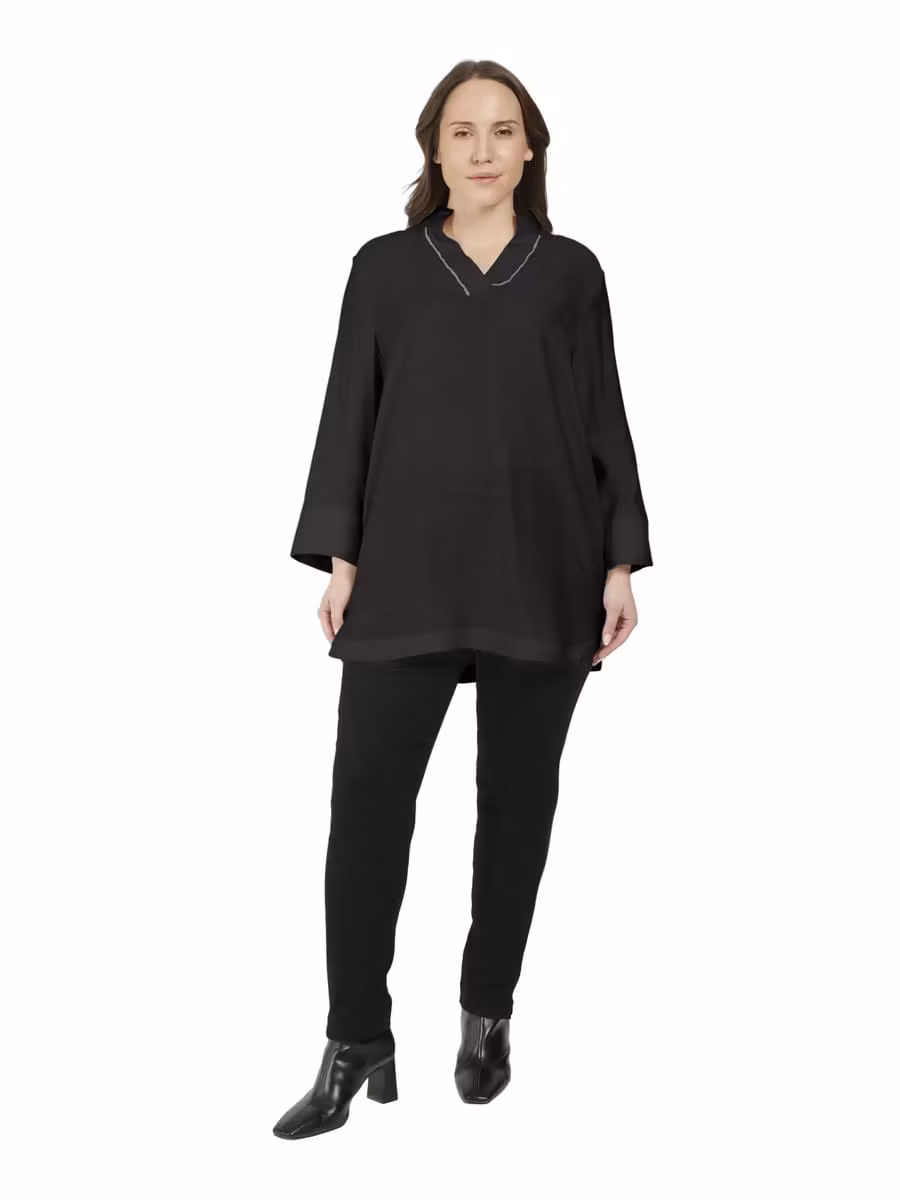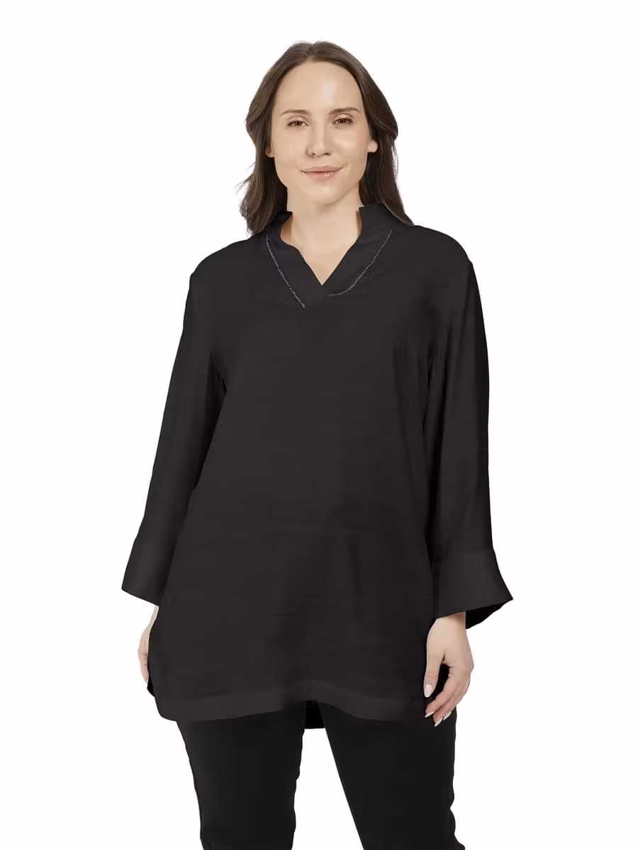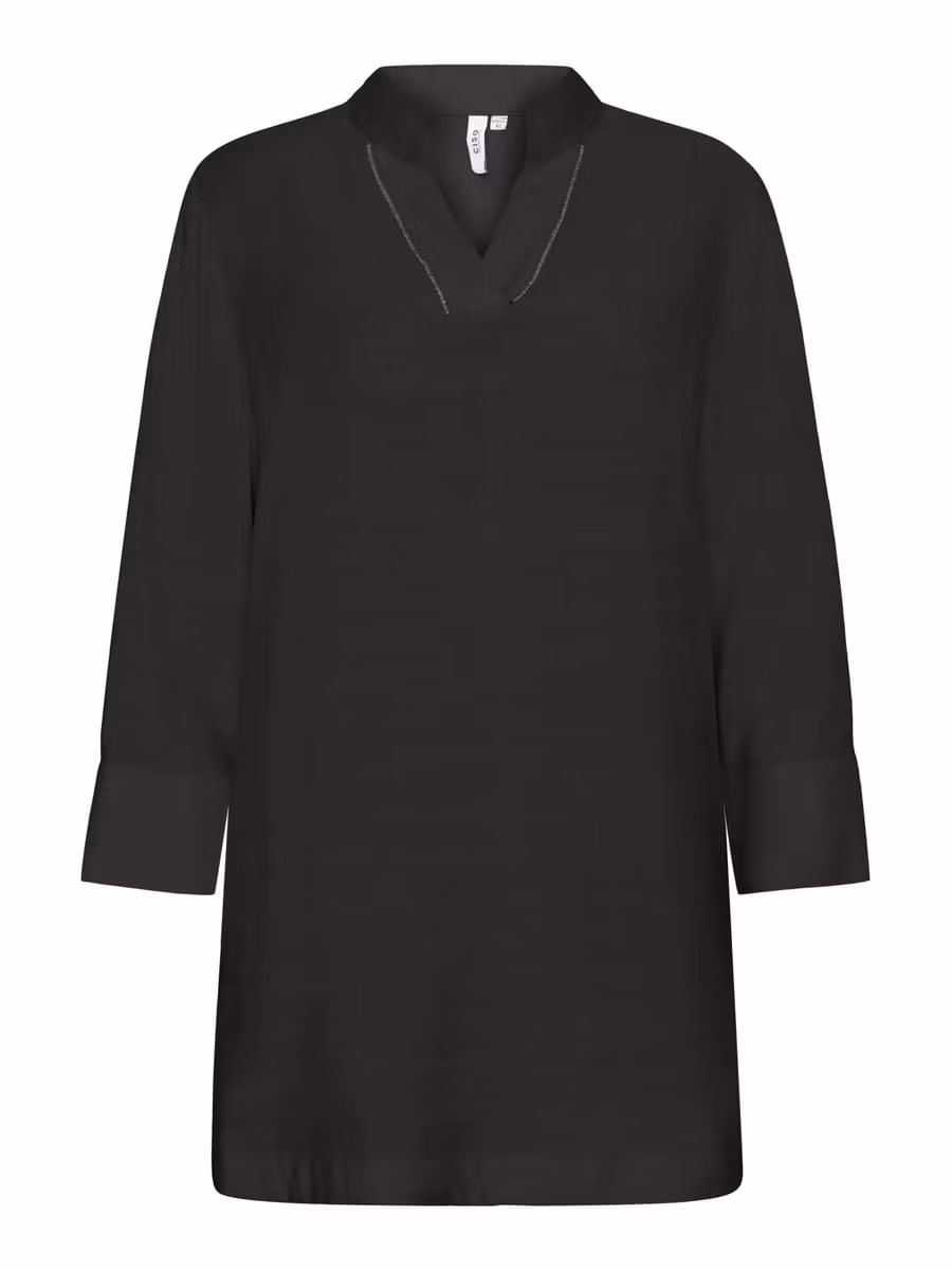 Superfin svart tunikablus som passar till det mesta. Fin V-halsringning med silverdetaljer. Ärmar med bred manschett nedtill med knappar som snygg detalj. Lite längre baktill och veckad i ryggen.