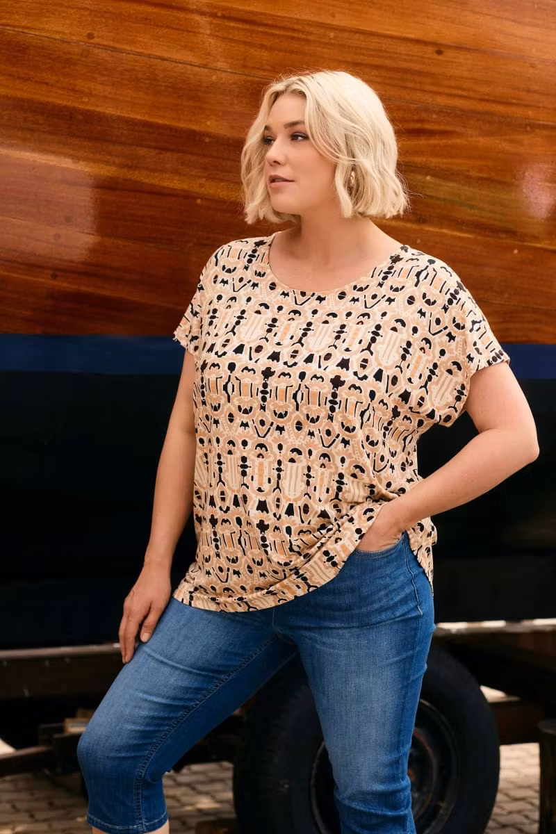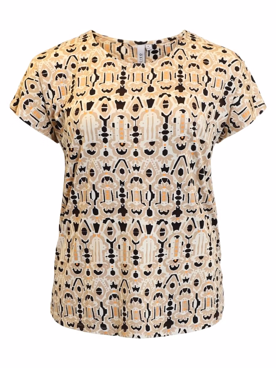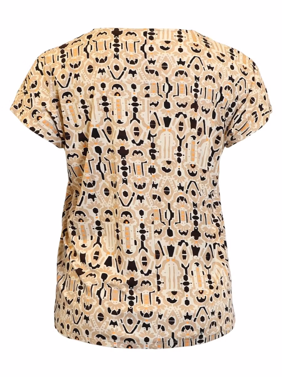 Skön topp med kort ärm i fina färger och mönster. Fin sommartopp till beige, svarta eller orangefärgade byxor.