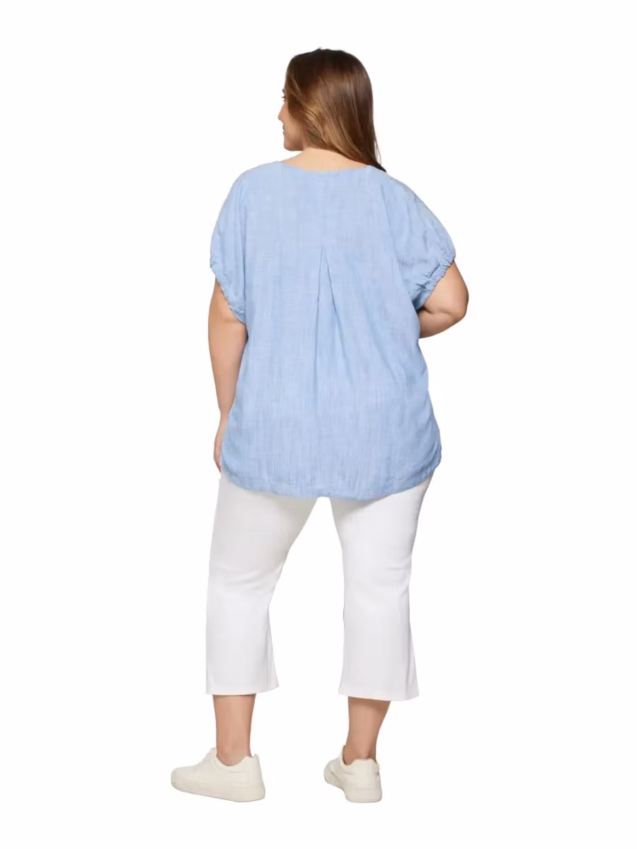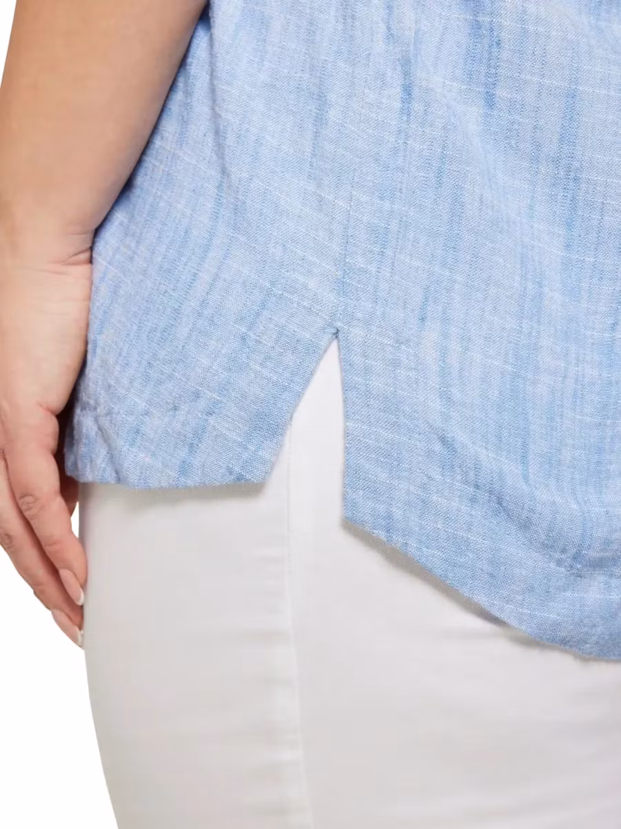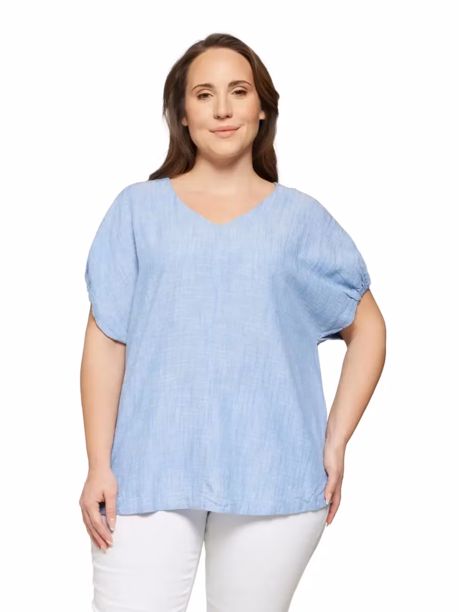 Skön blus/topp i snygg bluemelange färg. Korta ärmar med bra vidd och resår på den övre delen. Liten V-halsringning, sprund längst ner i sidan på toppen.