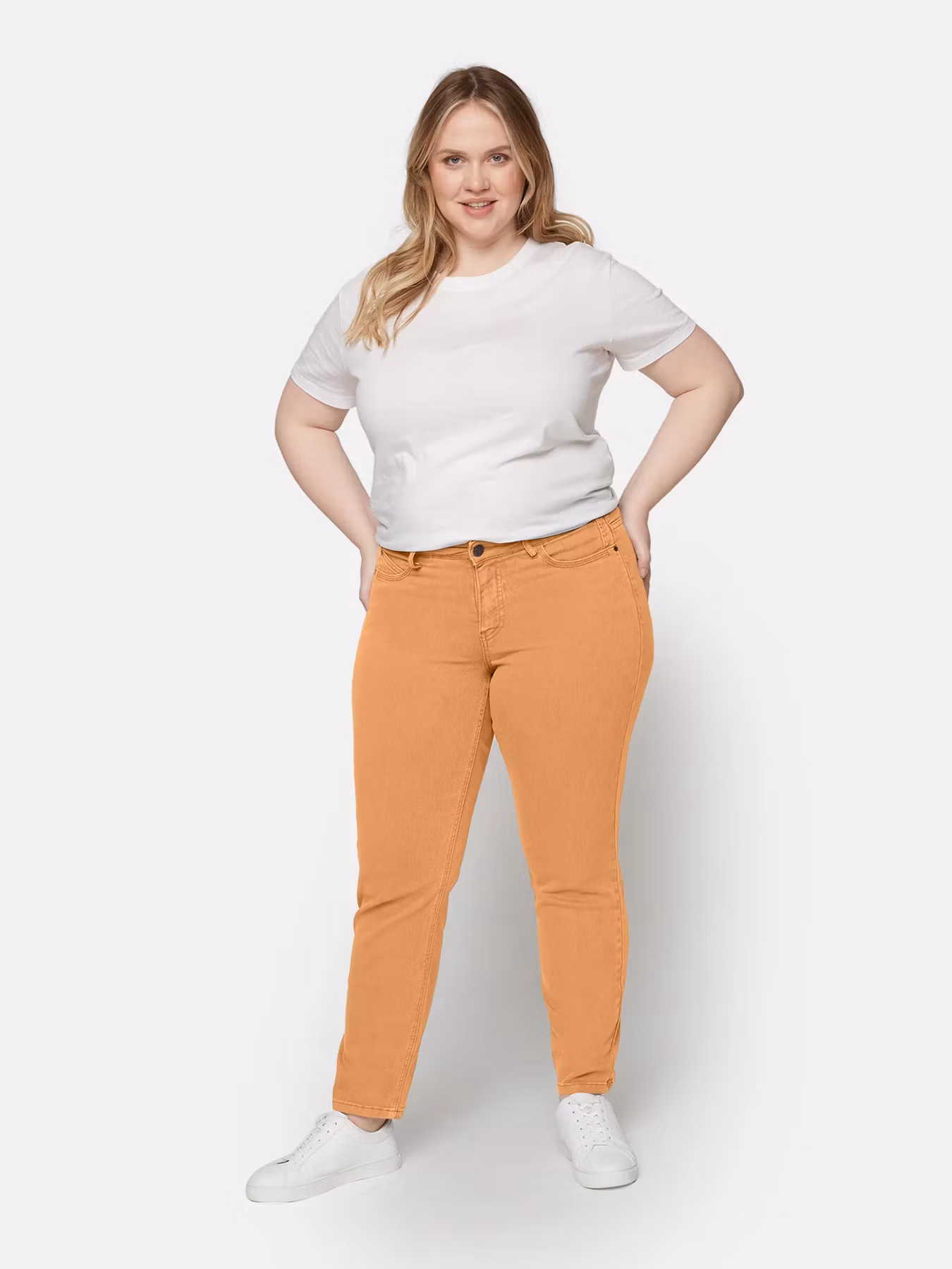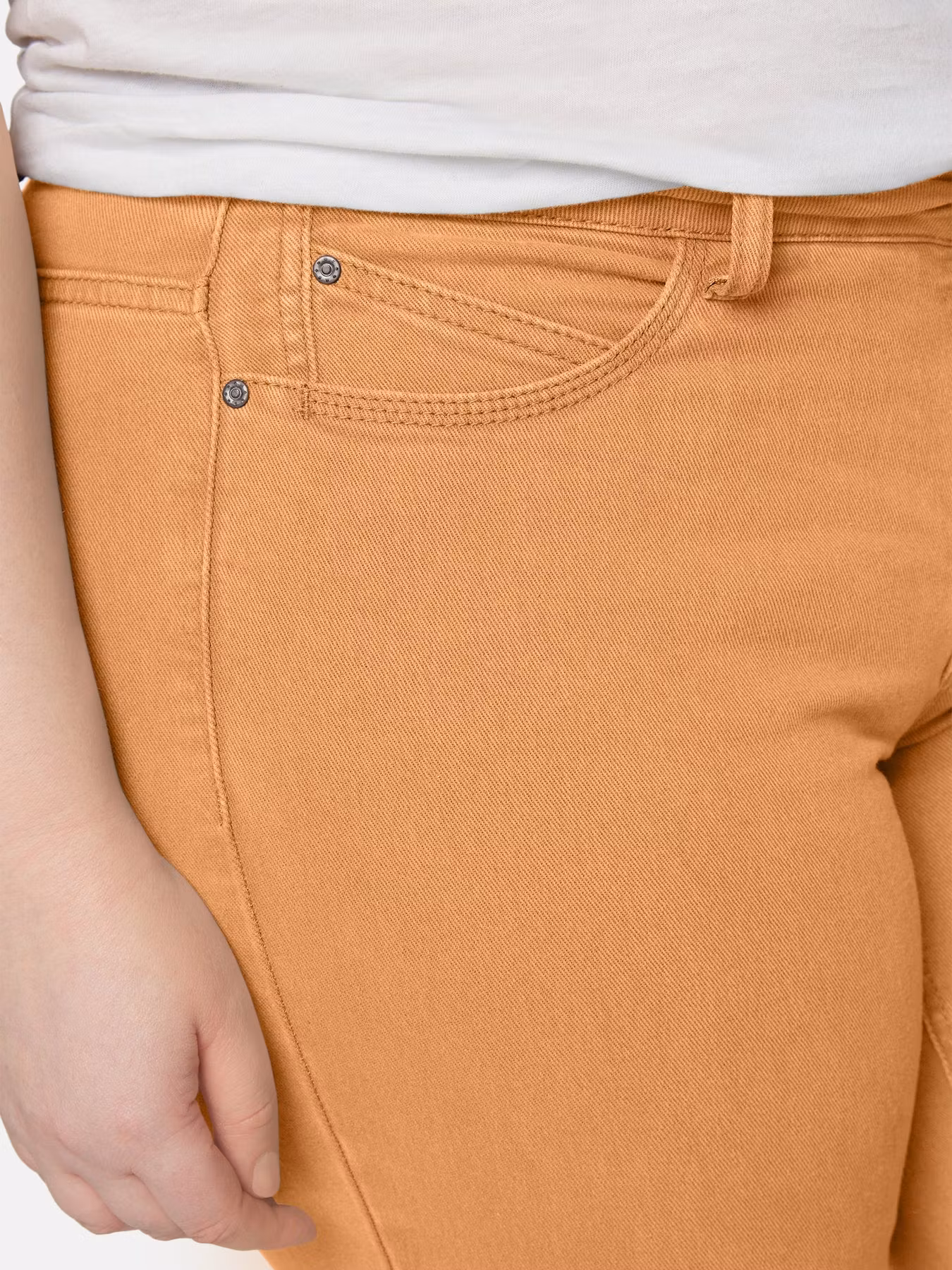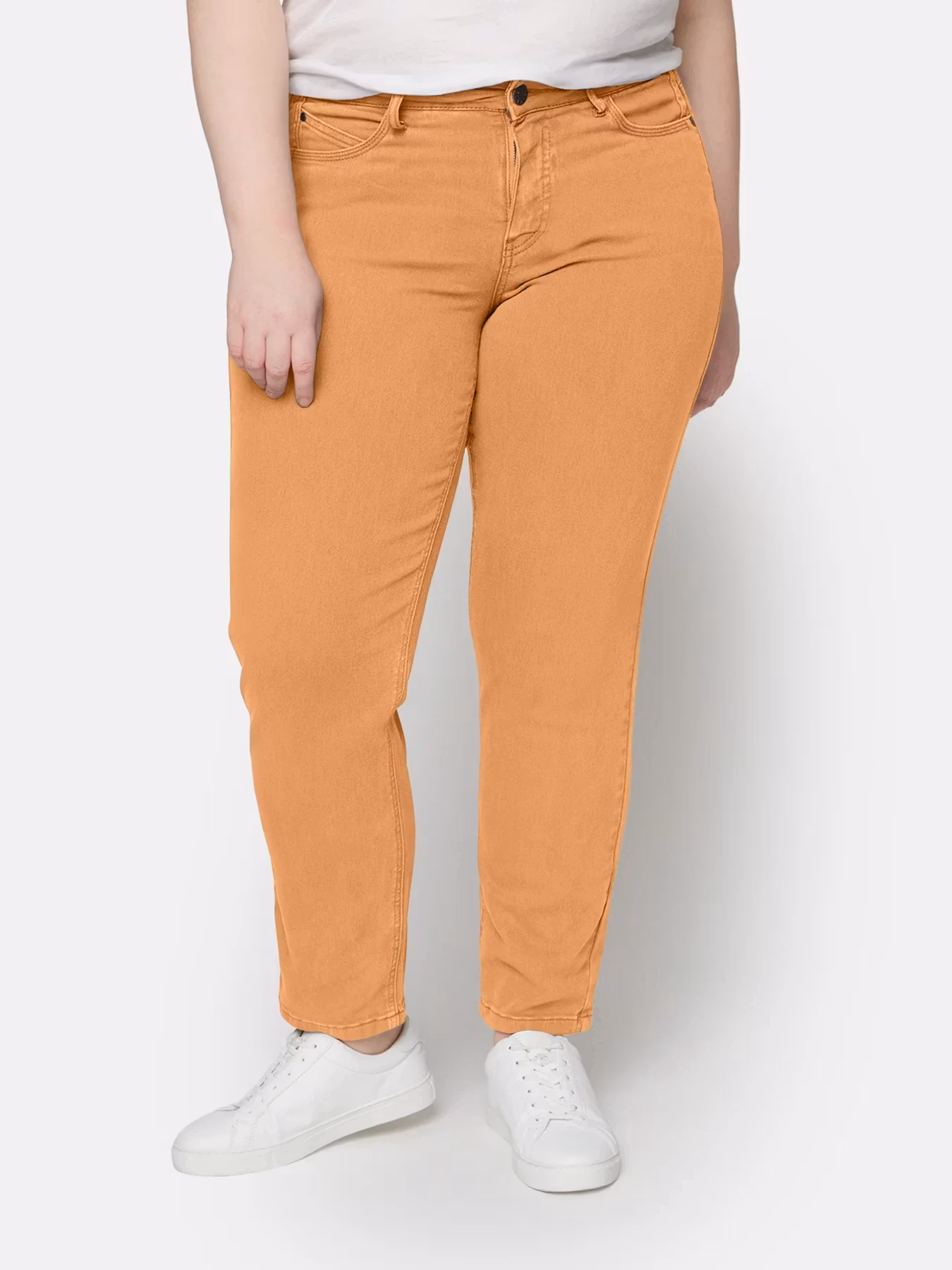 Skön behaglig Selmabyxa i jeansmodell med stretch. Fickor bak och fram samt påsydda hällor i linningen, dragkedja och knapp. Snygg aprikos färg!