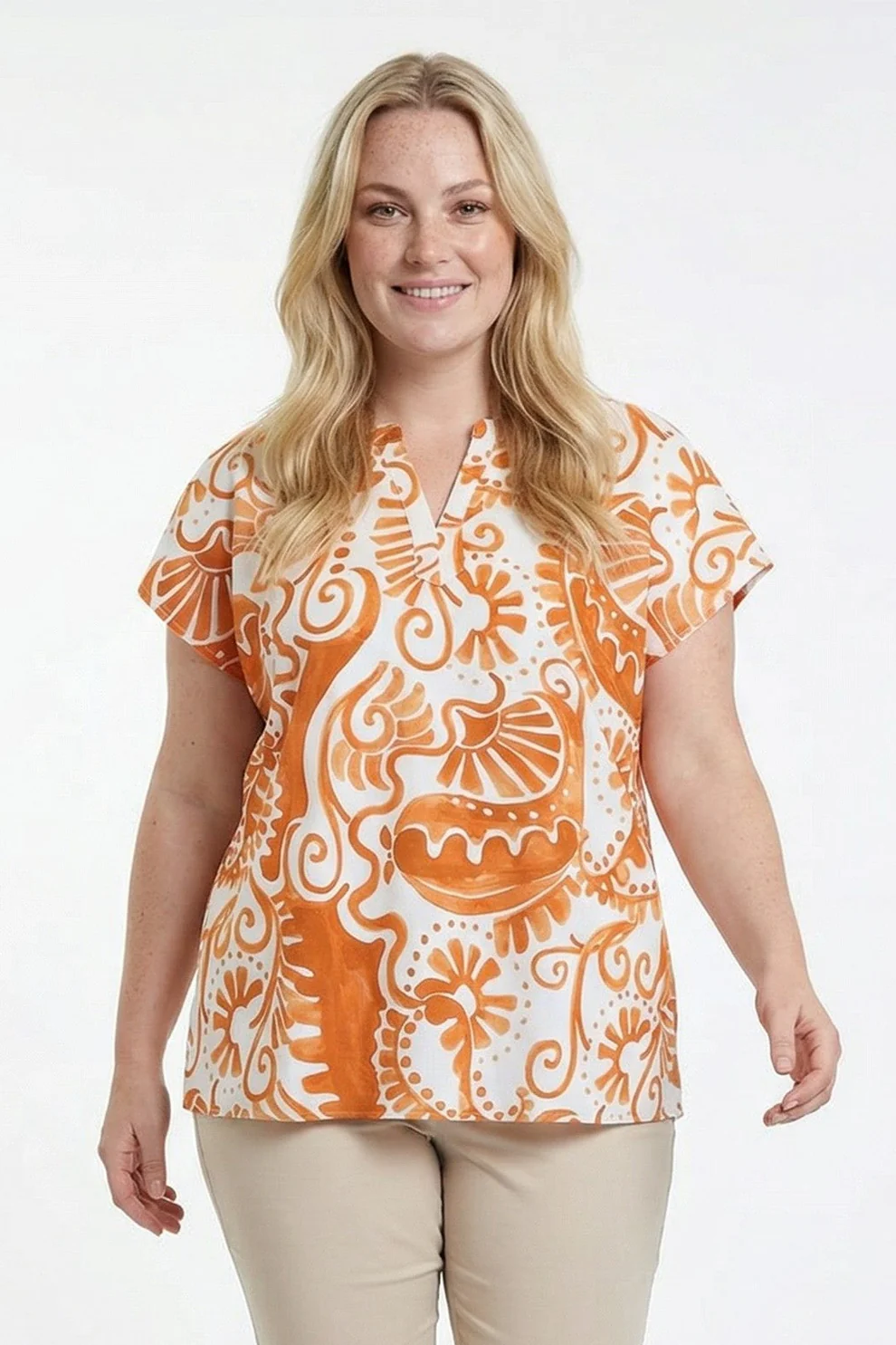 Underbar topp med kort ärm och V-halsringning. Fin topp som passar snyggt till beige, orangea eller svarta byxor i sommar.