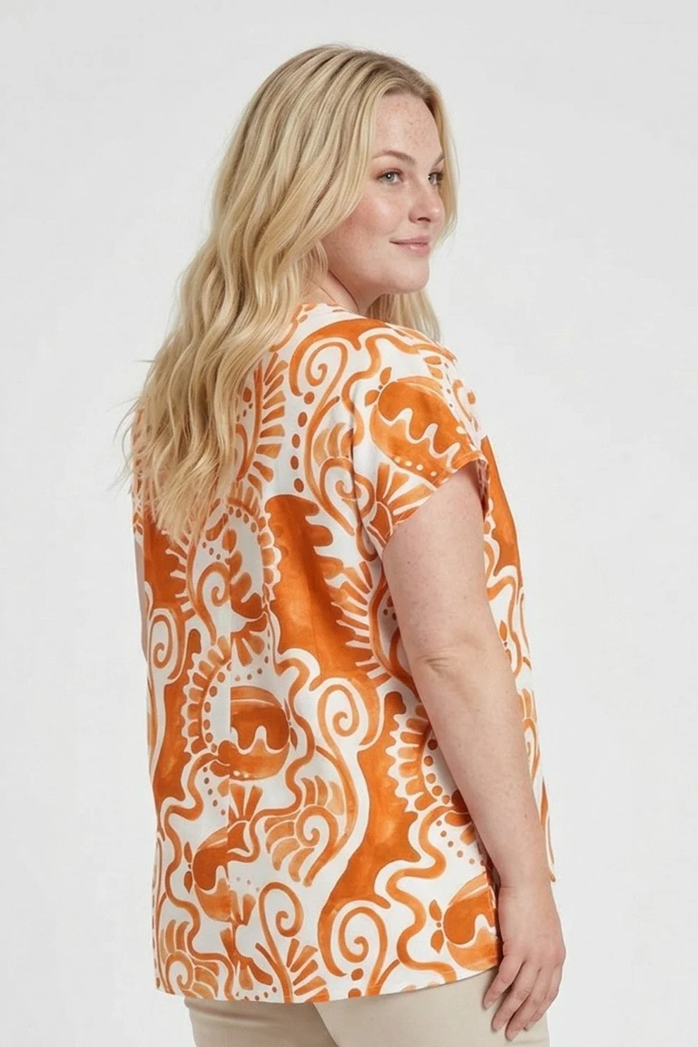 Underbar topp med kort ärm och V-halsringning. Fin topp som passar snyggt till beige, orangea eller svarta byxor i sommar. 100% ViskosFärg: Orange MixLängd ... [Se fullständig beskrivning]