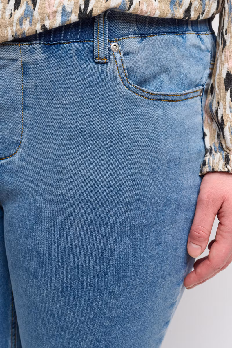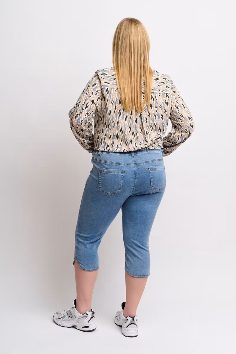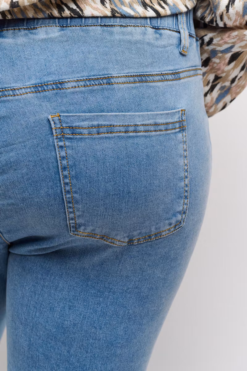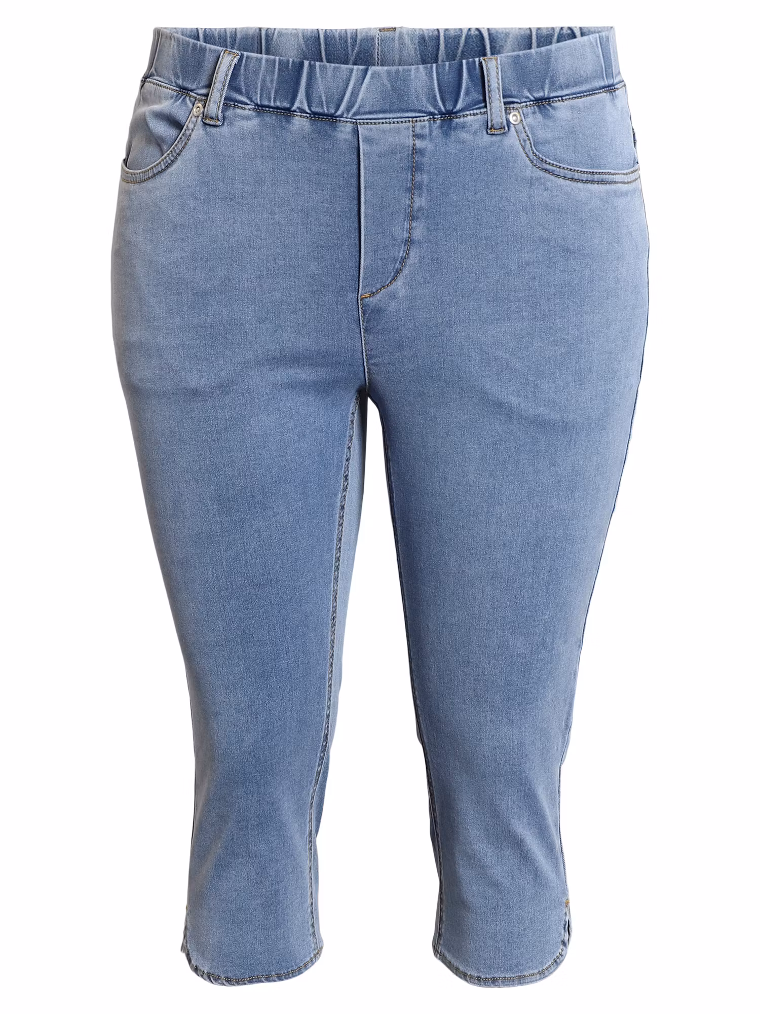 Snygga jeans i capri längd i färgen light blue med fickor fram och bak, falsk gylf. Sprund i benslut och resår i midjan för skön passform.