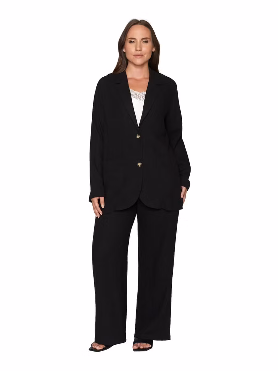Snygg rymlig ofodrad svart kavaj med krage/slag med djupt snitt och knäppning med 2 knappar. 2 påsydda fickor. Härlig kvalitet i lin/viskos. Matcha med byxa i s ... [Se fullständig beskrivning]