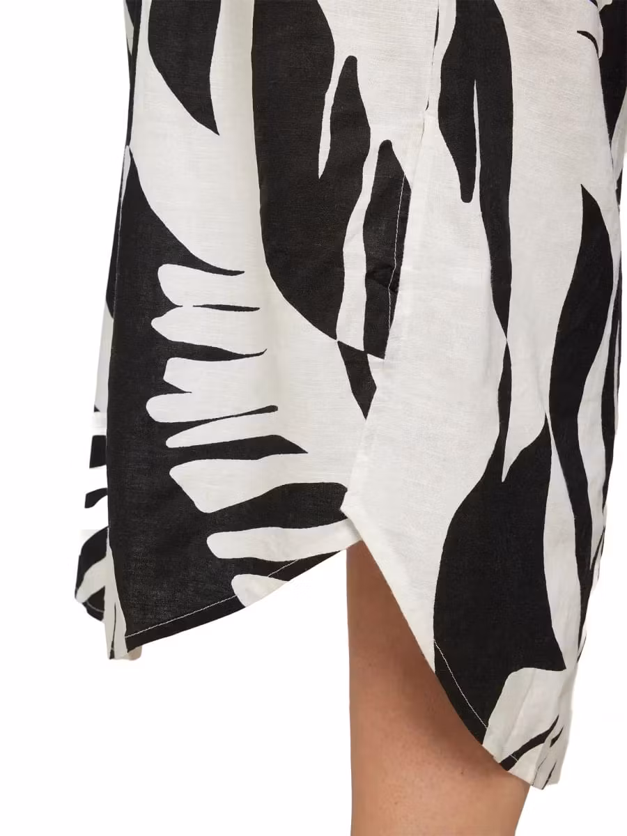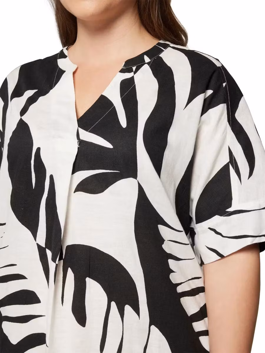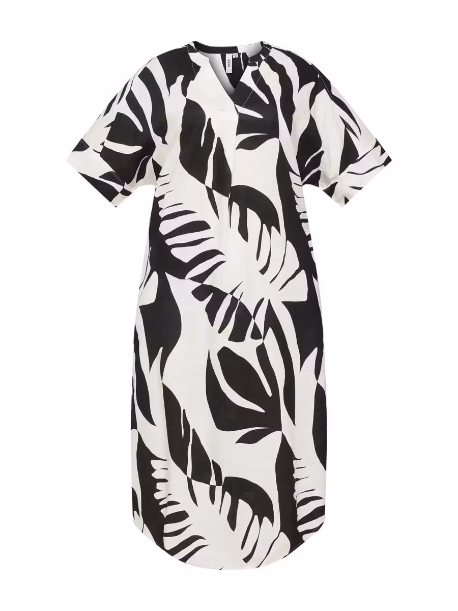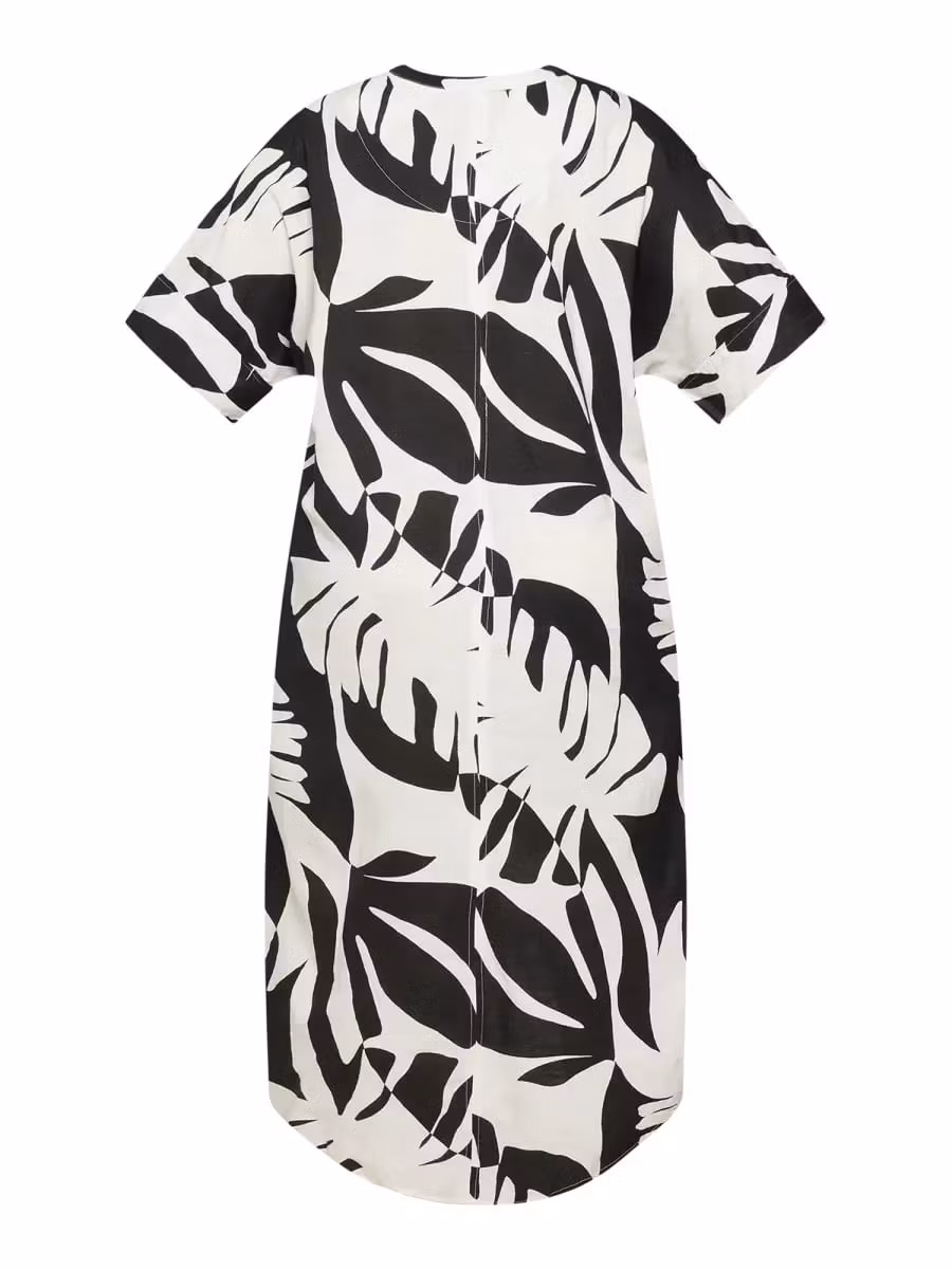 Skön klänning i snyggt print med 1/2 ärmar och fickor. V-halsringning och ett veck framtill för bra passform. Rundan nedtill och något längre baktill. Underbar klänning till sommarens festligheter.