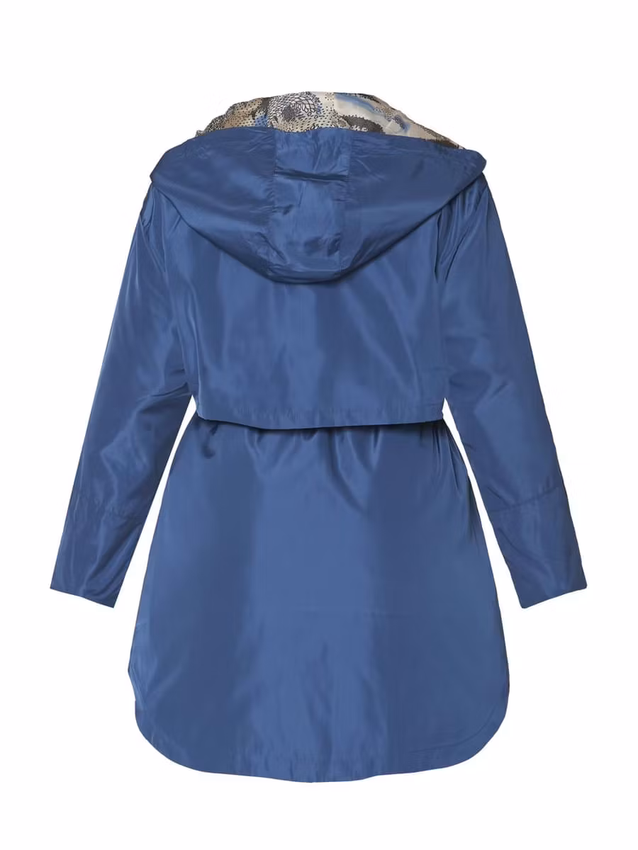 Superfin jacka i härlig blå färg med fickor. Genomgående knäppning med kraftig dragkedja och band att dra åt i midjan. I ryggen är där ett slag som går ner till midjan. Hätta med snyggt foder och ett band för att dra åt för skydd mot väder och vind.