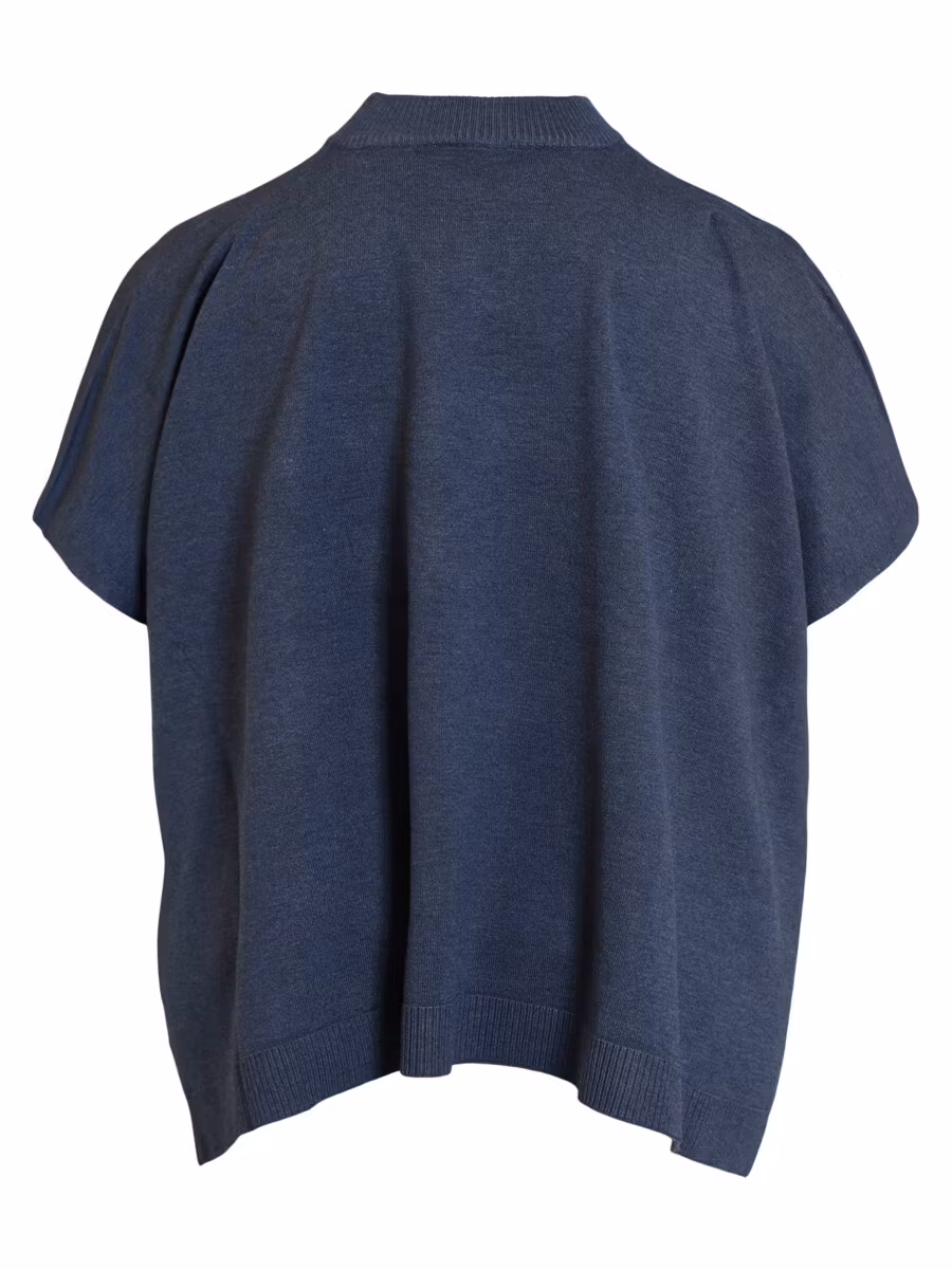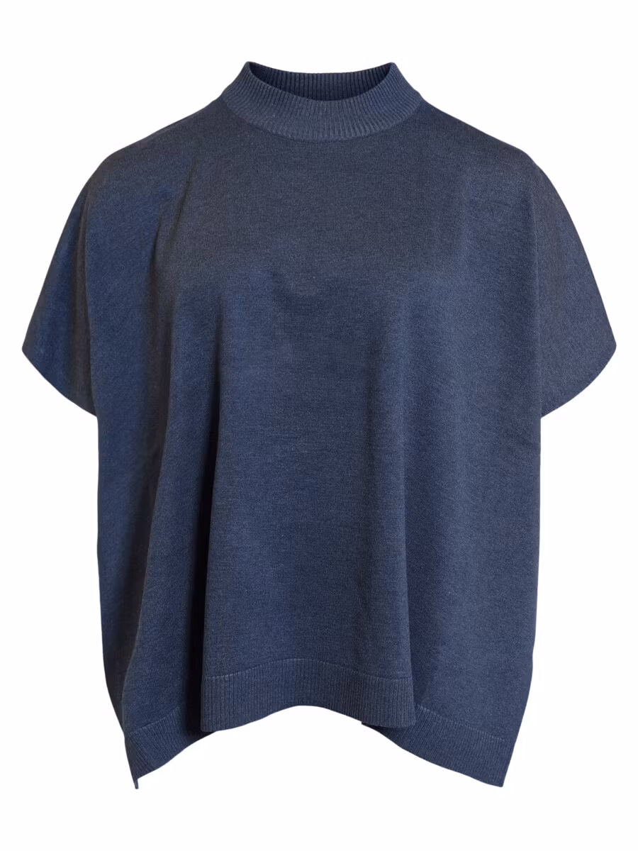 Mörkblå melange poncho med ribbad mjuk rund krage, ribbad nederkant. Underbar luftig och mjuk kvalitet som faller fint! Praktiskt användbar plagg och ett m ... [Se fullständig beskrivning]