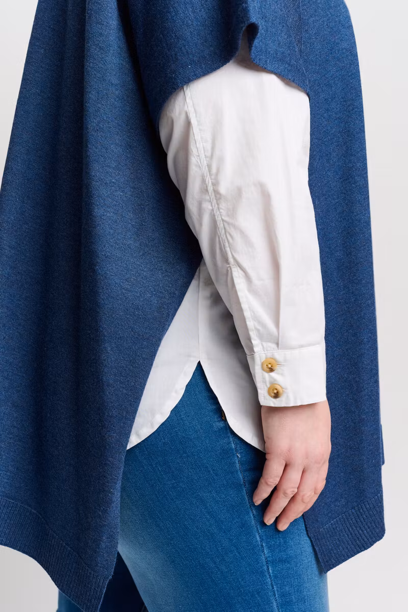 Mörkblå melange poncho med ribbad mjuk rund krage, ribbad nederkant. Underbar luftig och mjuk kvalitet som faller fint! Praktiskt användbar plagg och ett måste i garderoben!