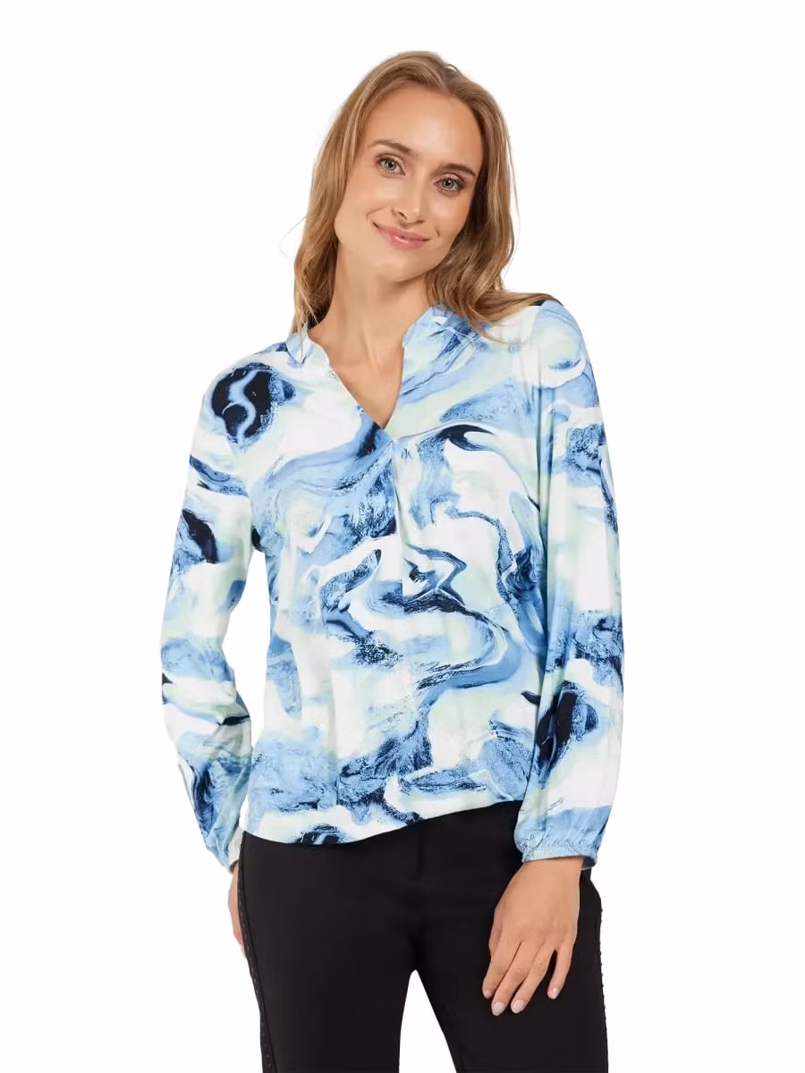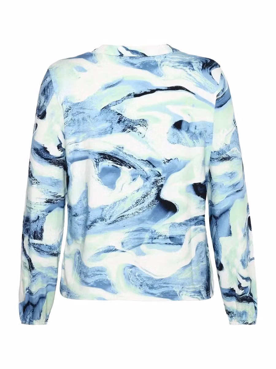 Skön topp i härliga färger. Långa ärmar med resår nedtill. Rund hals med ett V framtill. Veck framtill för bra passform. Snygg till ett par jeans!