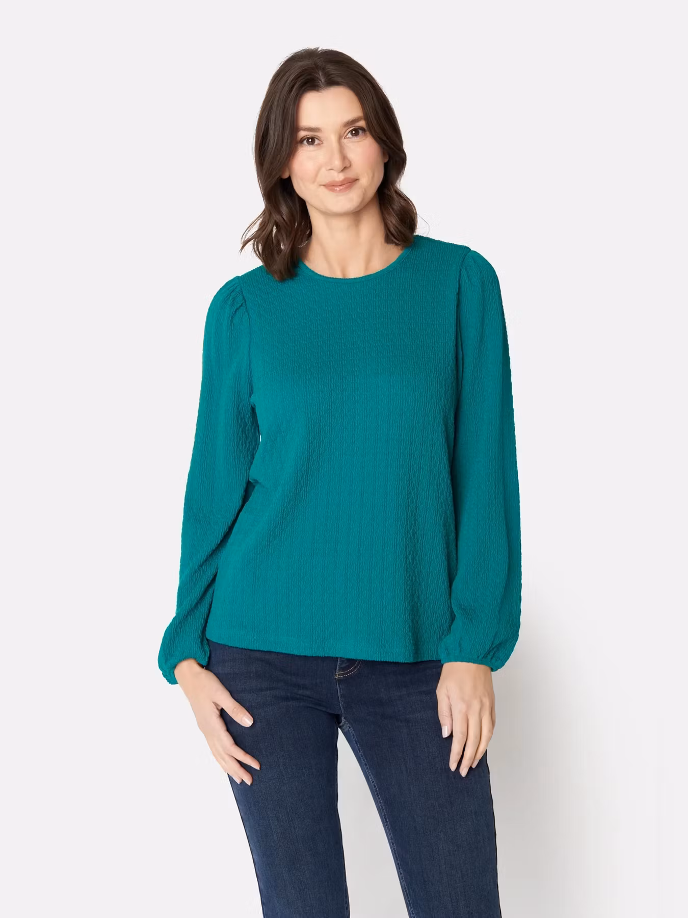 Mjuk och skön tröja med långa ärmar och rund halsringning. Ärmarna är rynkade vid axeln och rymliga med resår nedtill.