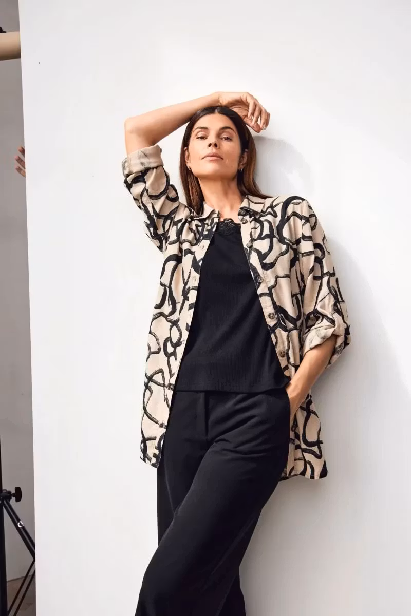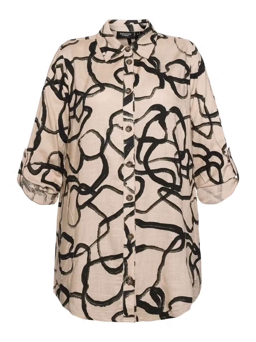 Skön skjorta i snyggt print. Krage och genomgående knäppning med knappar. Långa ärmar som går att vika upp och fästa med en stropp. Passar fint till beige eller svarta byxor.