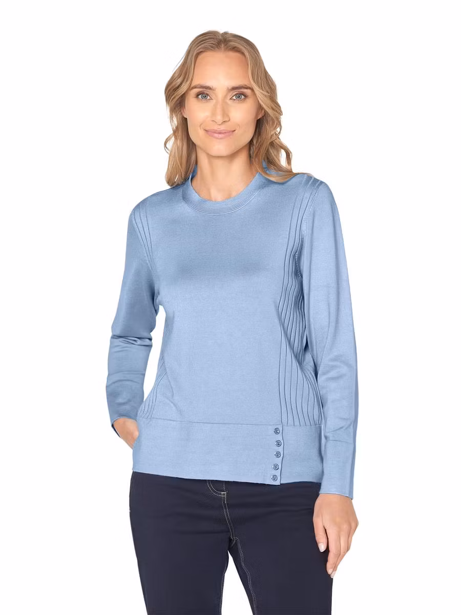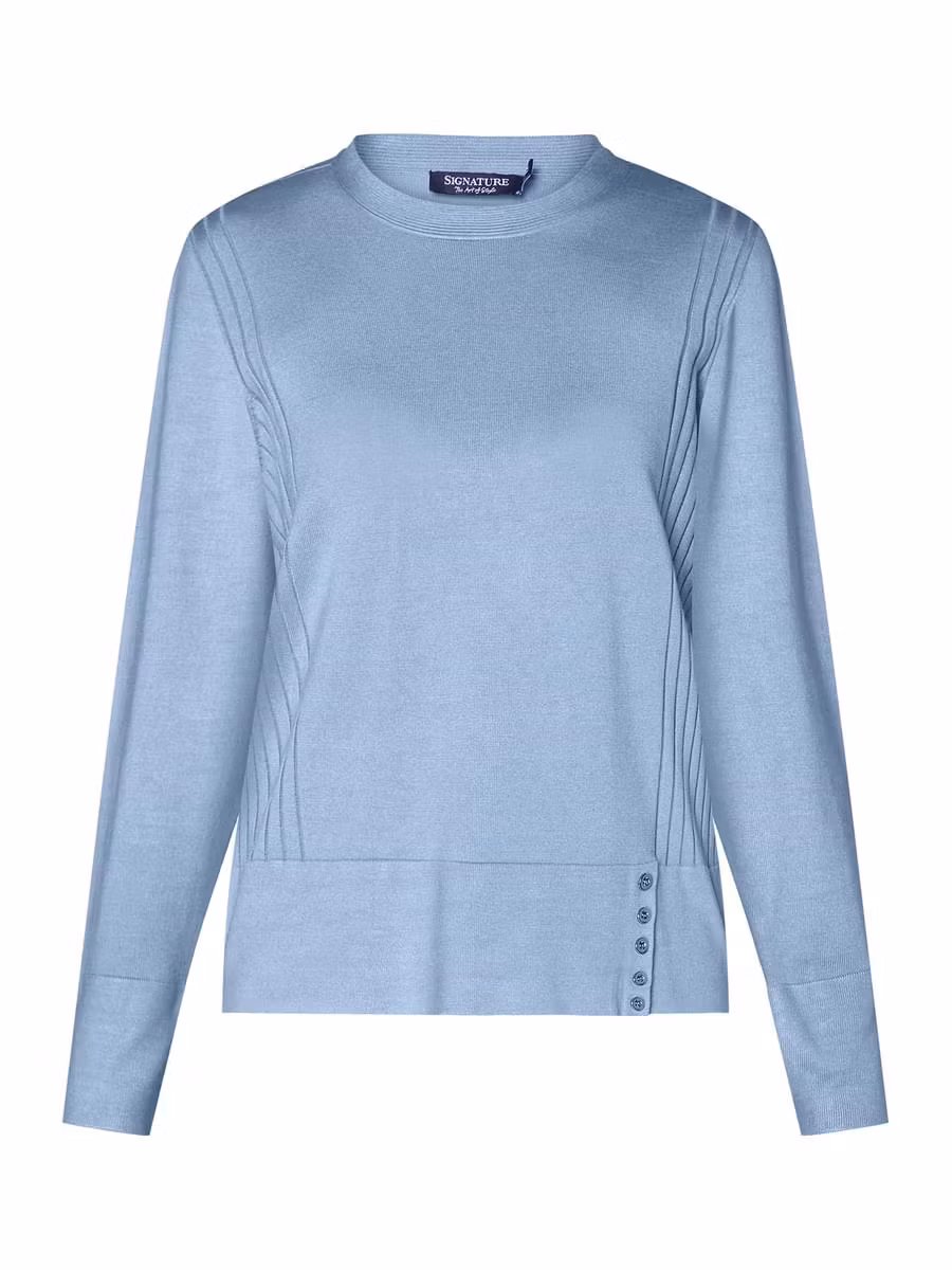 Fint slätstickad tröja med långa ärmar, rund halsringning och snygga detaljer. Skön kvalitet och passar bra till ett par jeans.
