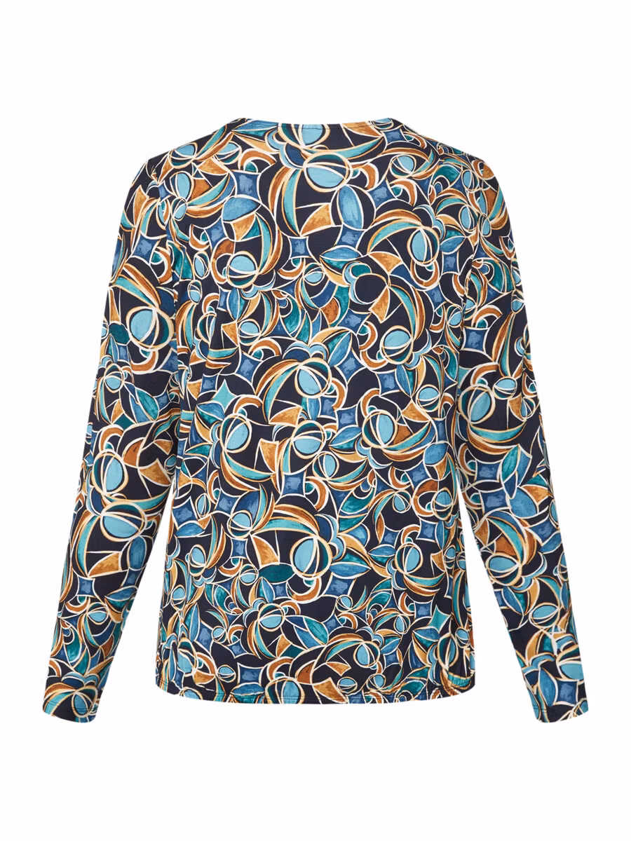 Fin topp med snyggt mönster och härliga blå färger. Långa ärmar , resår i nederkant och fin rund halsringning. Snygg till ett par jeans eller marinblå byxor.