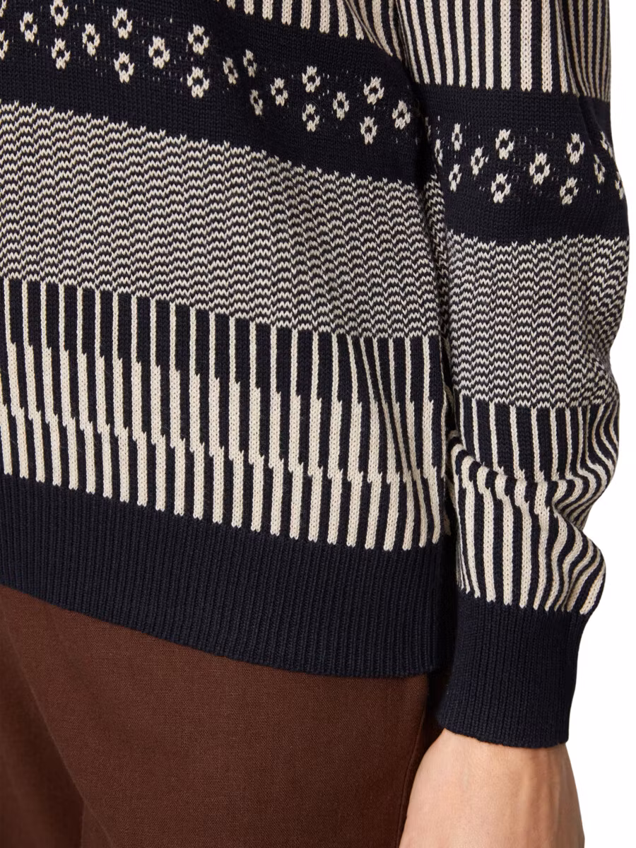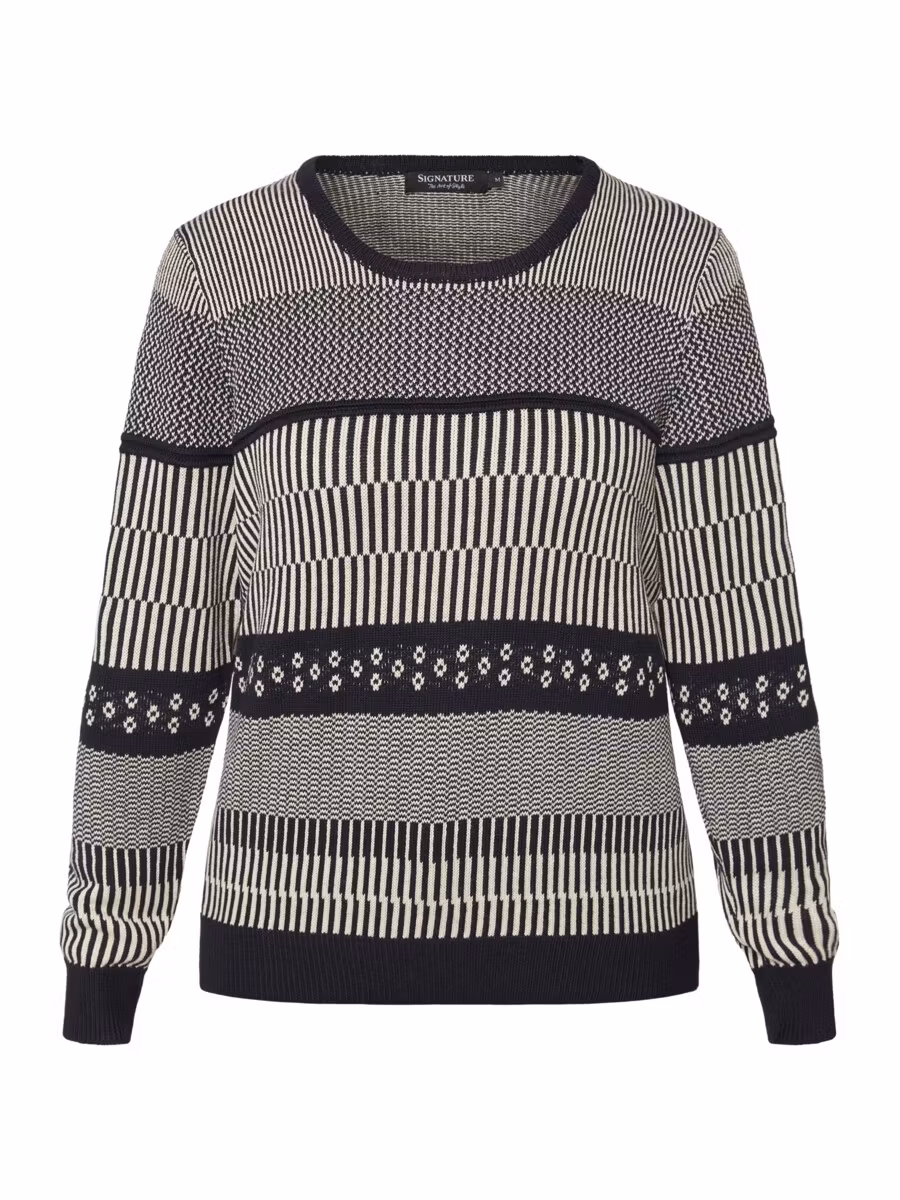Snygg tröja i marinblå toner och fint mönster. Skön kvalitet, rund halsrigning, ribbad kant i ärmslut och nedtill på tröjan.