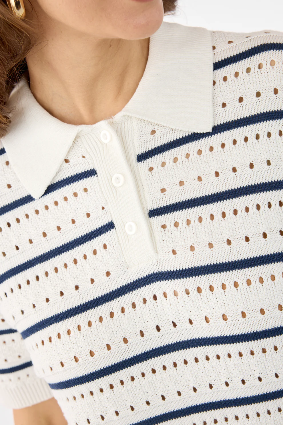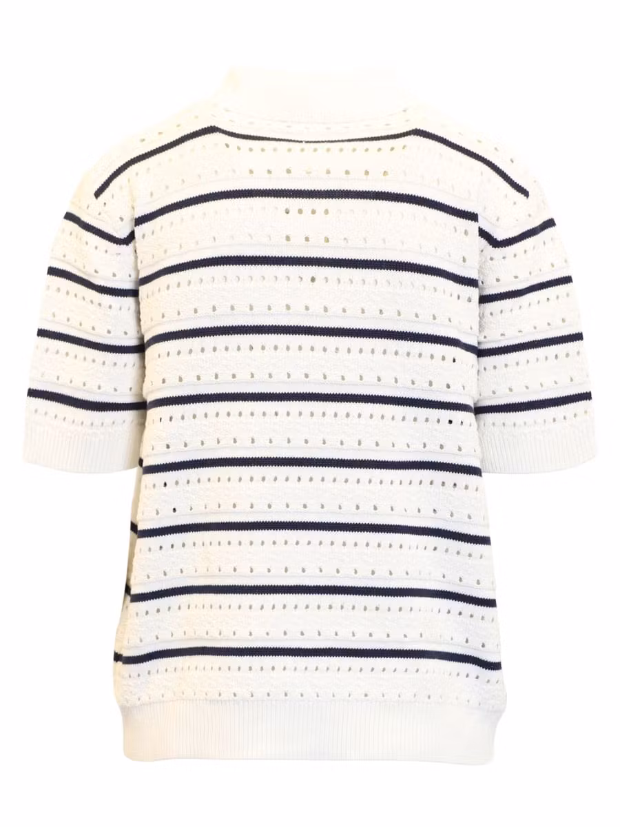 Underbar moderiktig mjuk topp med hålmönster. Halsringning med krage och knappar. 1/2 lång ärm. Snygg till jeans eller marinblå byxor.