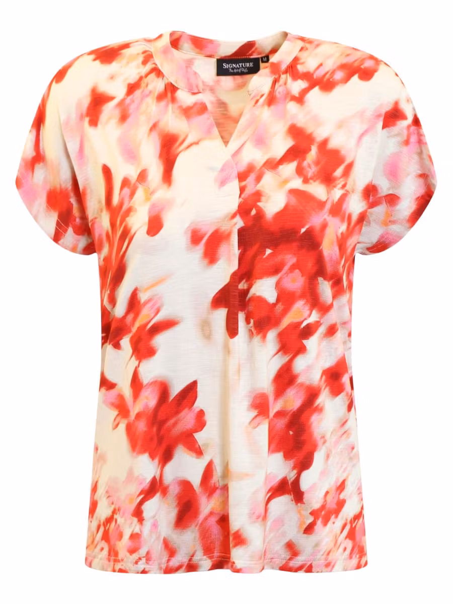 Skön topp med korta ärmar och V-halsringning. Snygg till ett par vita eller beige byxor. 95% Viskos, 5% Elastan Färg: TomatoLängd: 62 cmTvättråd: Fint ... [Se fullständig beskrivning]