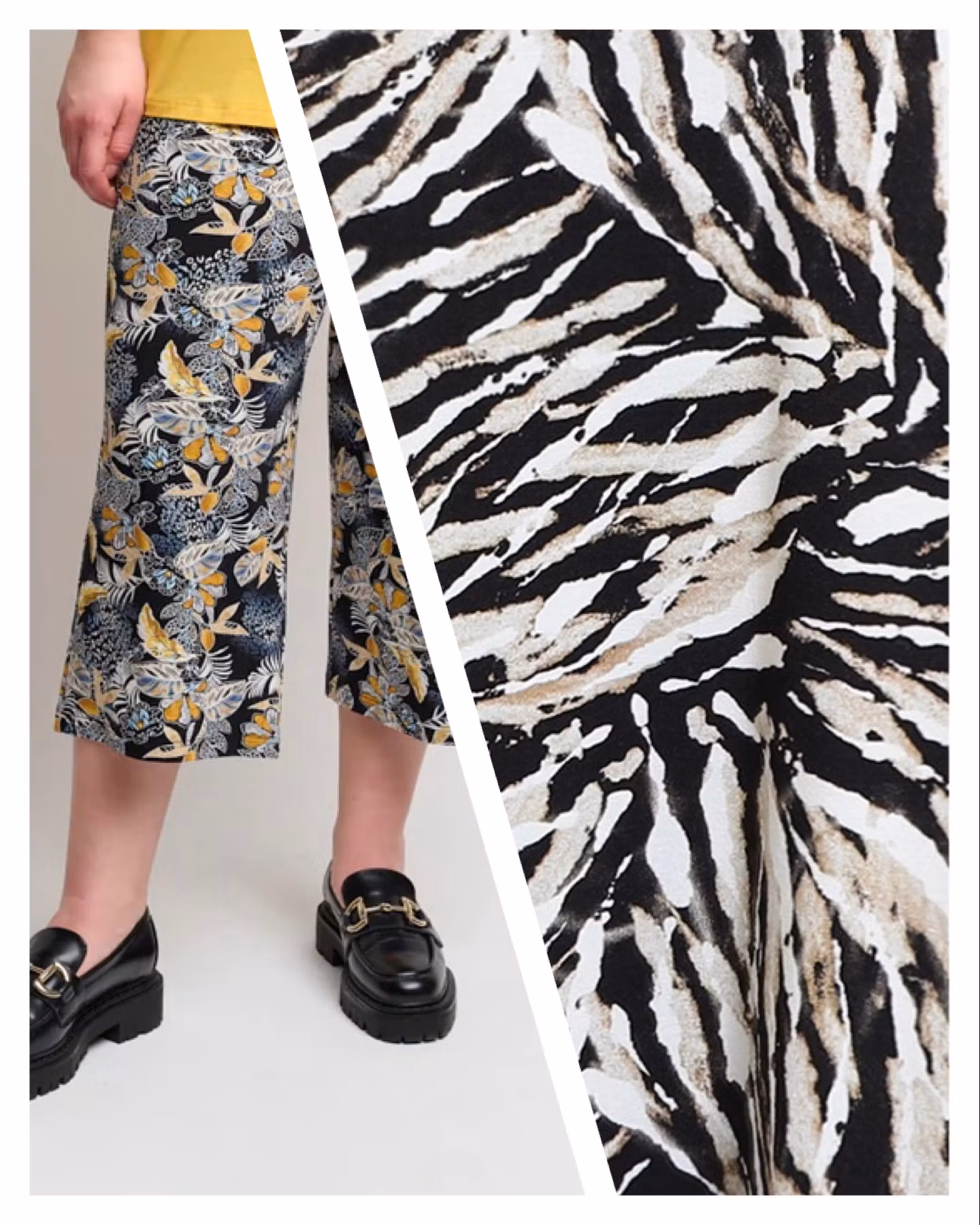 Snygga lediga byxor i svart/beige toner med resår i midjan och genomgående knappar framtill. Perfekta byxan till vardag eller fest.