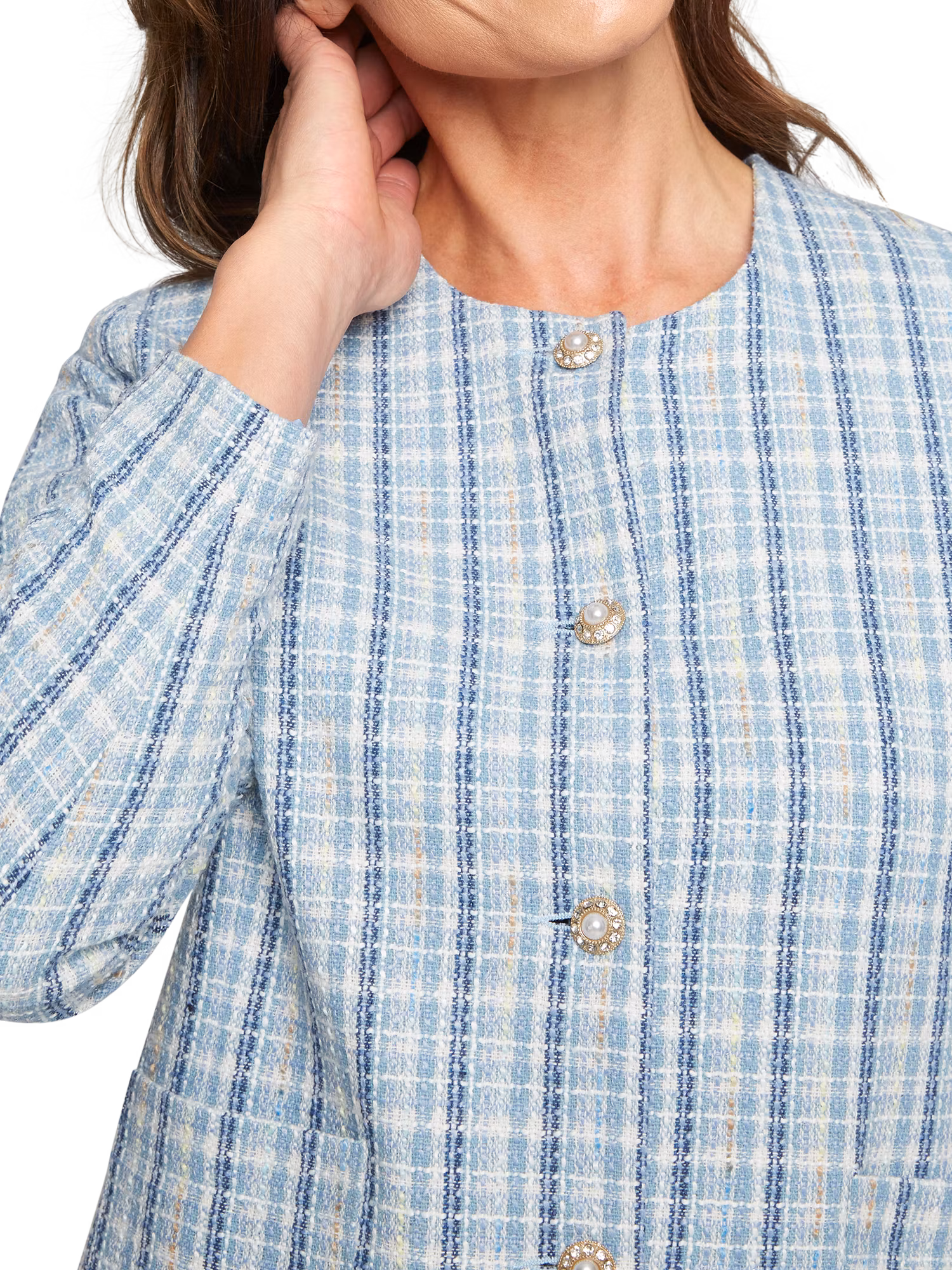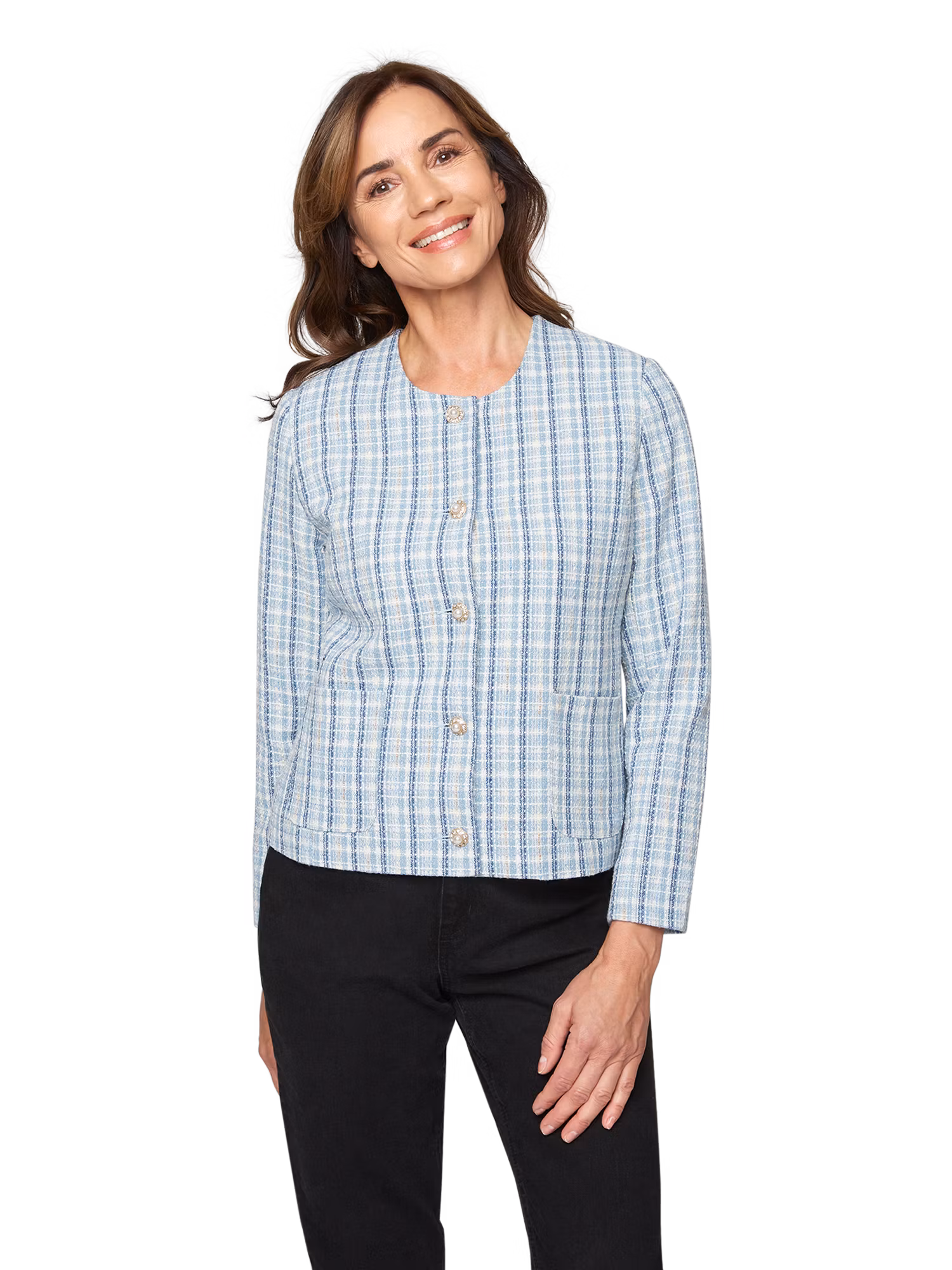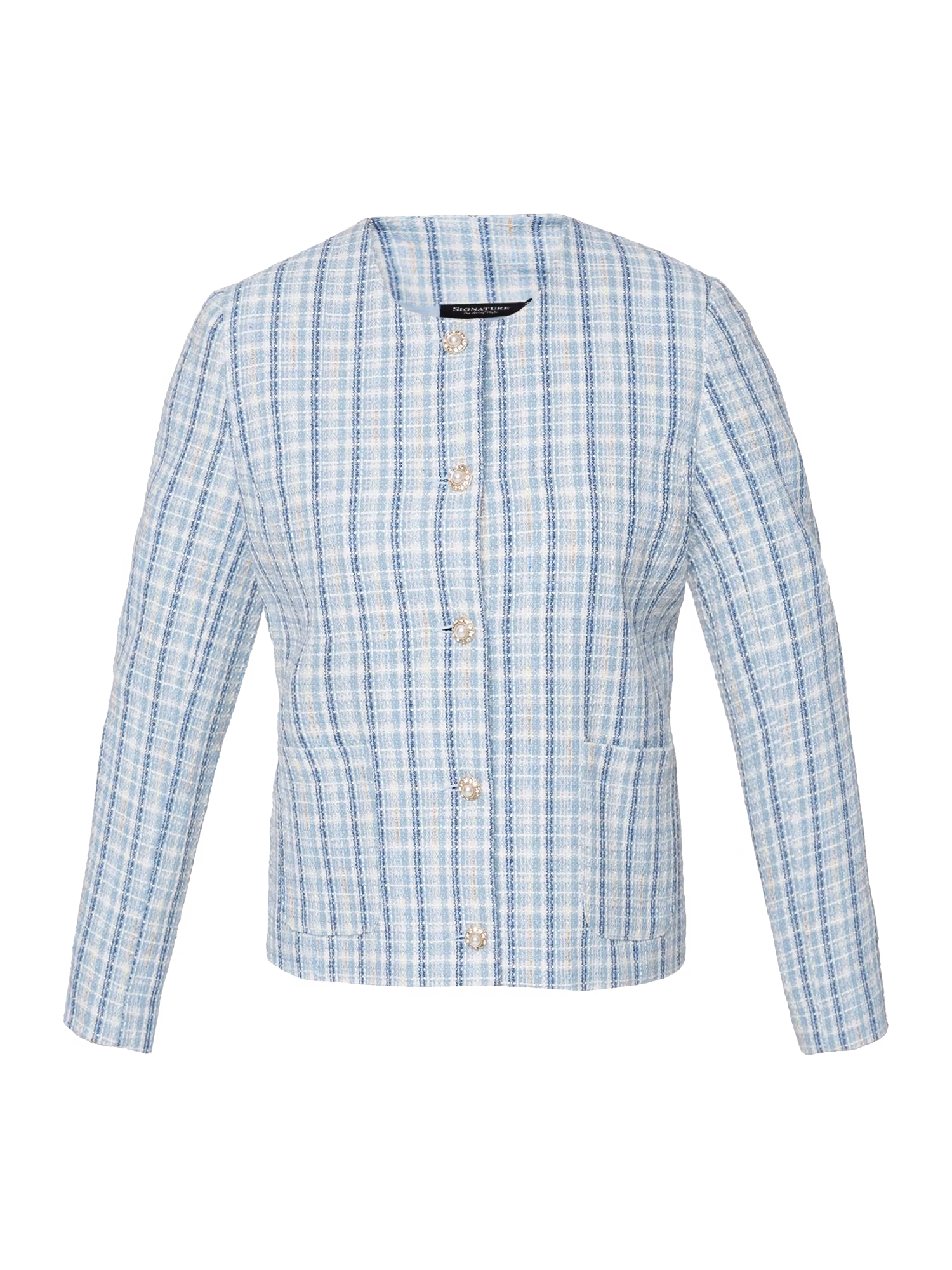 Otroligt fin kavajjacka i härliga ljusa blåa färger med lyxiga knappar. Bär jackan stängd eller öppen över en blus. Öppna fickor framtill. Välklätt till arbetet eller till fest.