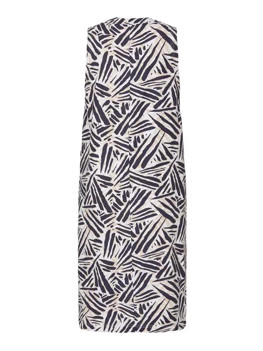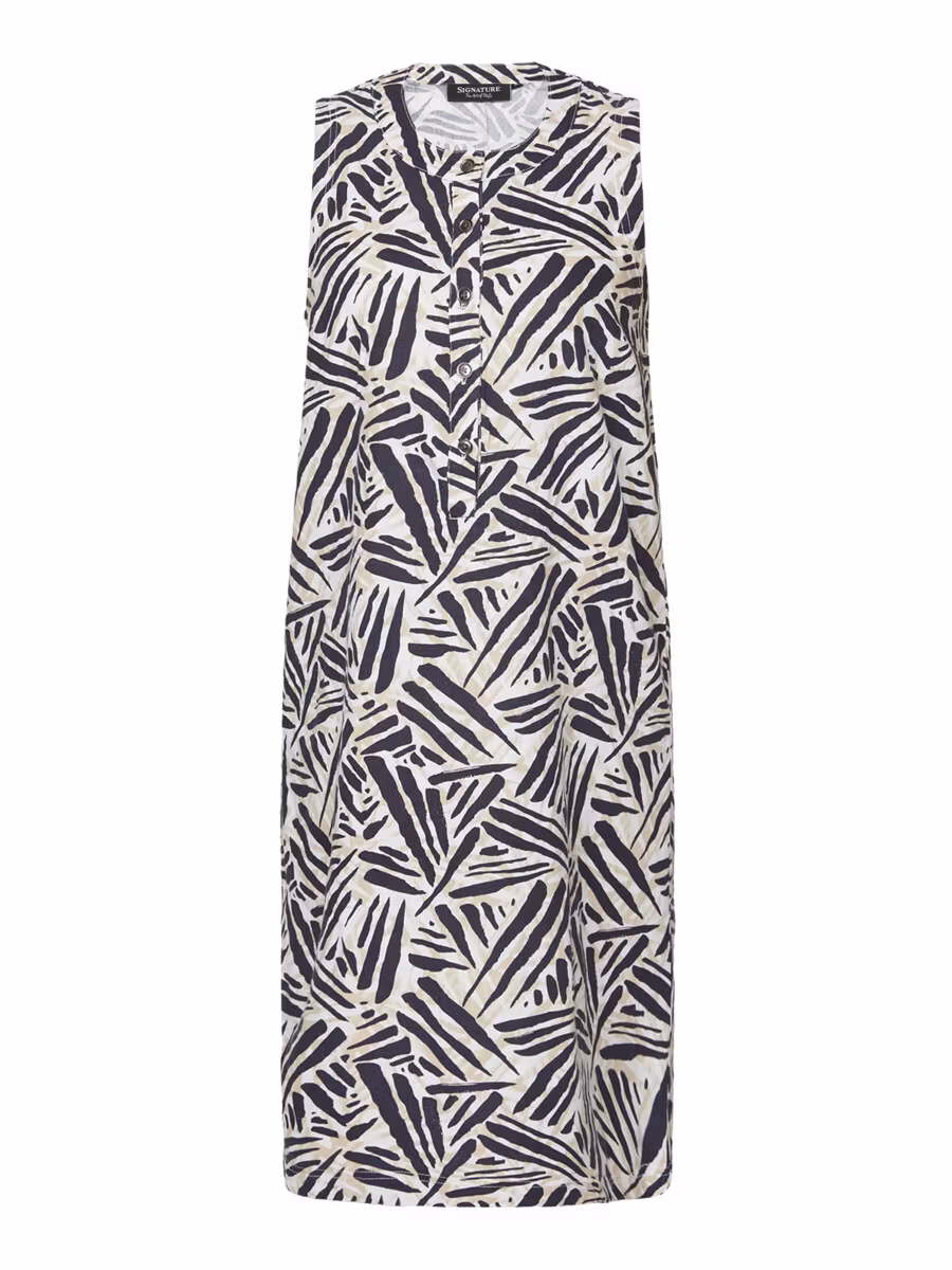 Härlig ärmlös klänning i färgerna mörkblått/beige/vitt. Rund halsringning med knappar framtill. Snygg och skön klänning till sommarens alla festligheter. Matcha med mörkblå jacka i samma kvalitet.