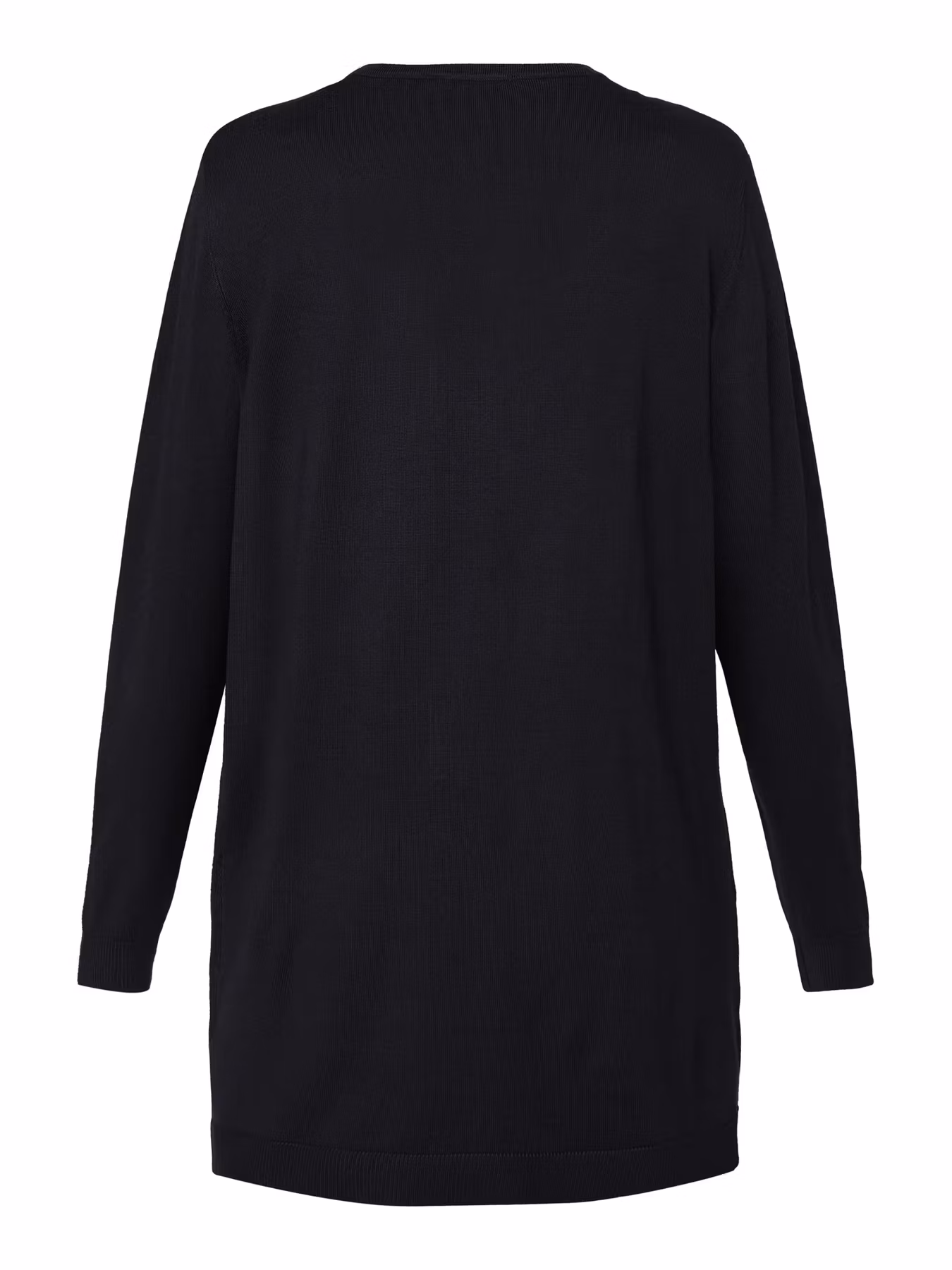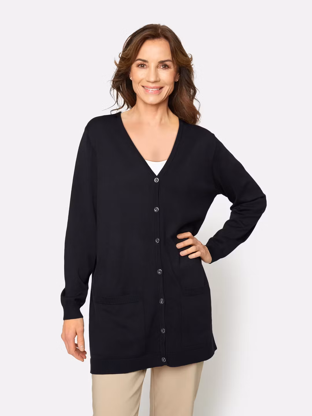 Fin användbar V-ringad svart kofta, genomgående knäppning med fina knappar. 2 fickor framtill. Ribbad kant nedtill på koftan samt nederst på de långa ... [Se fullständig beskrivning]