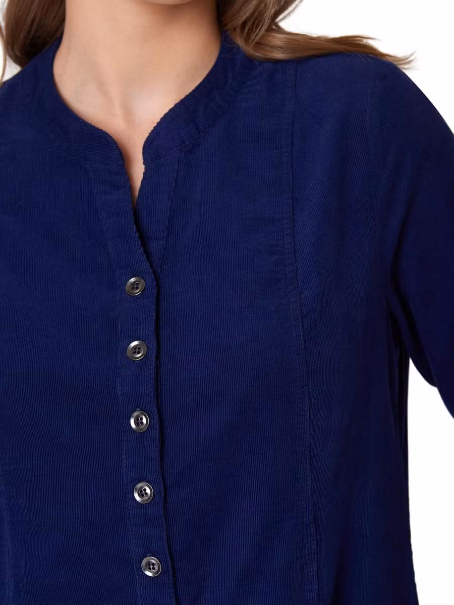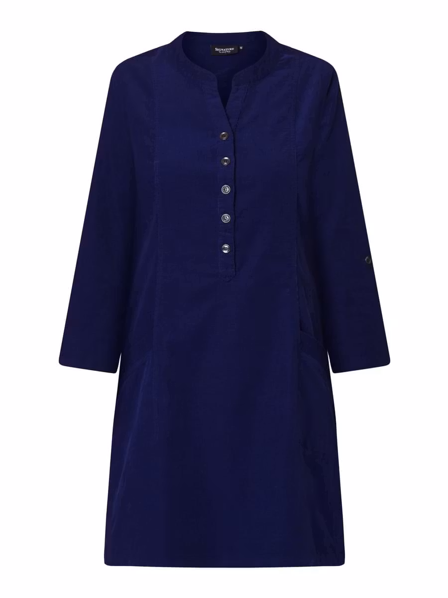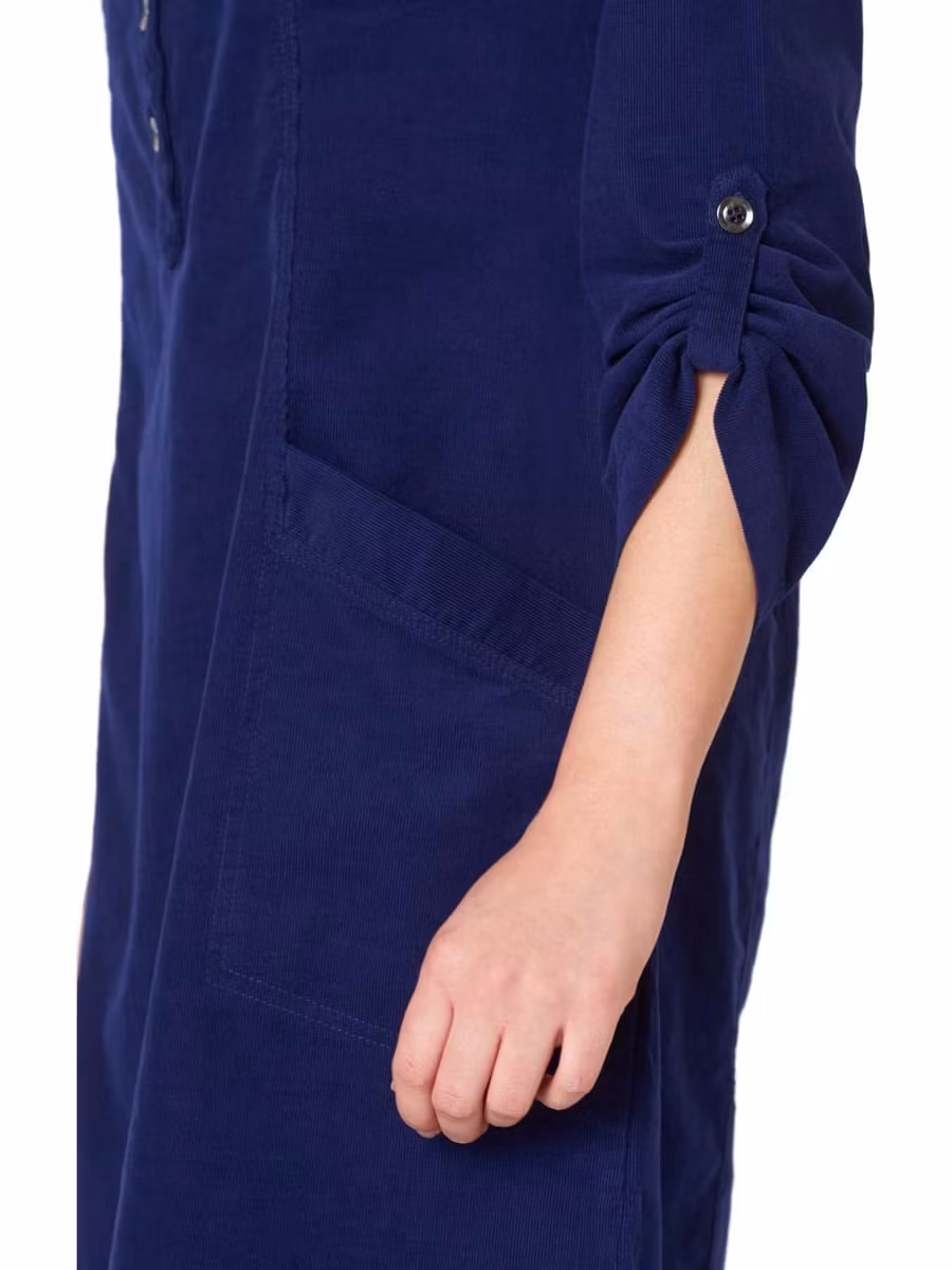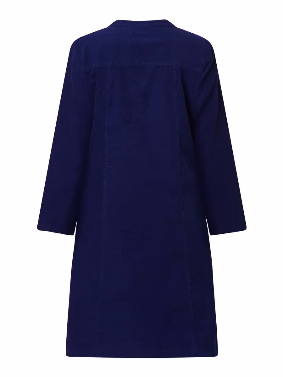 Underbar smalspårig A-formad manchesterklänning i snygg blå färg. Fickor, 3/4 ärmar med stropp och knapp för längdjustering. Halsringning med knappar framtill. ... [Se fullständig beskrivning]