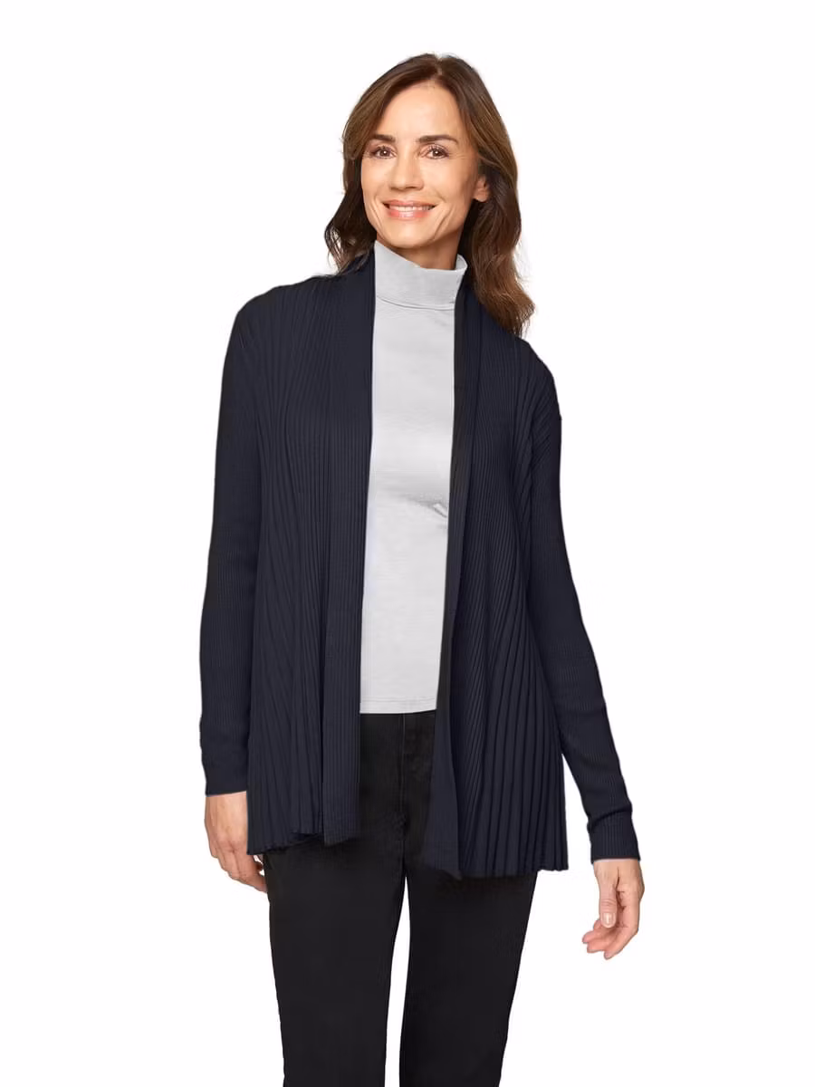 Snygg öppen marinblå ribbad kofta med långa ärmar och krage. Härlig stretchkvalitet som passar till både vardag och fest.