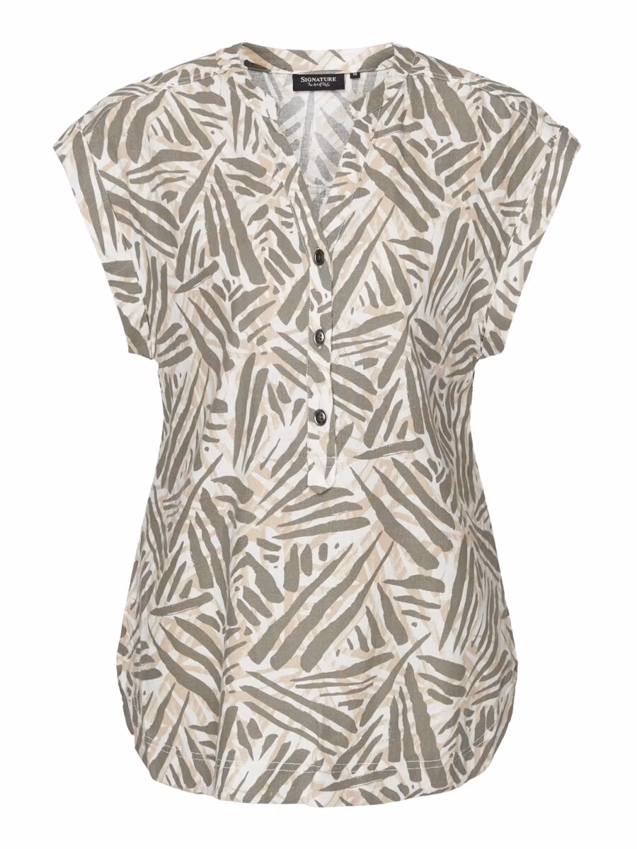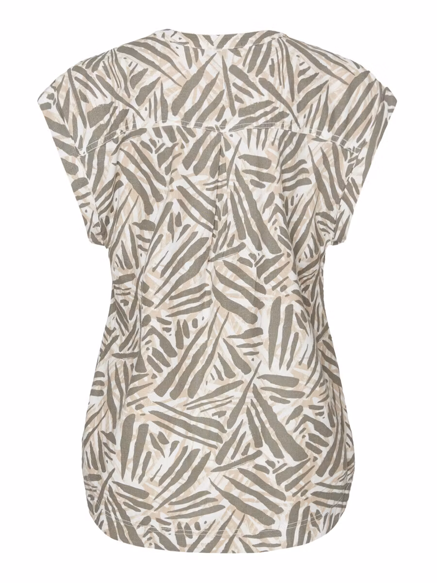 Snygg topp i milda blå/beige toner med korta ärmar och V-halsringning med knappar framtill. Härlig sval kvalitet!