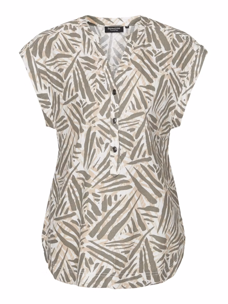 Snygg topp i milda gröna/beige toner med korta ärmar och V-halsringning med knappar framtill. Härlig sval kvalitet!
